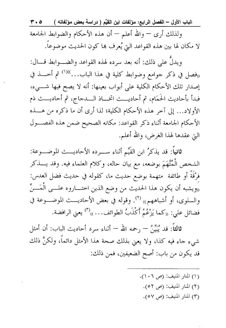 ويدلُّ على ذلك: أنه بعد سرده لهذه القواعد والضوابط قال: "فصل في ذكر جوامع وضوابط كلية في هذا الباب…"1 ثم أخذ في إصدار تلك الأحكام الكلية على أبواب بعينها: أنه لا يصح فيها شيء، فبدأ بأحاديث الحَمَام، ثم أحاديث اتخاذ الدجاج، ثم أحاديث ذم الأولاد ... إلى آخر هذه الأحكام الكلية؛ لذا أرى أن ما ذكره من هذه الأحكام الجامعة أثناء ذكر القواعد: مكانه الصحيح ضمن هذه الفصول التي عقدها لهذا الغرض، والله أعلم.