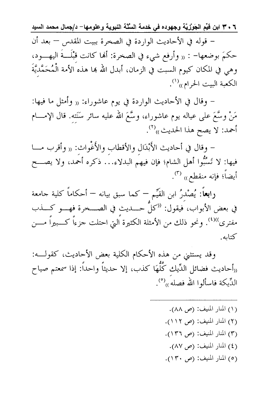 رابعاً: يُصْدِرُ ابن القَيِّم - كما سبق بيانه - أحكاماً كلية جامعة في بعض الأبواب، فيقول: "كلُّ حديثٍ في الصخرة فهو كذب مفترى"4. ونحو ذلك من الأمثلة الكثيرة التي احتلت جزءاً كبيراً من كتابه.