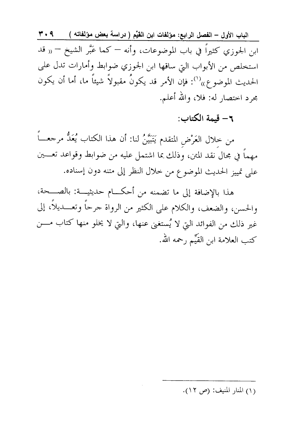 من خِلال العَرْضِ المتقدم يَتَبَيَّنُ لنا: أن هذا الكتاب يُعَدُّ مرجعاً مهماً في مجال نقد المتن، وذلك بما اشتمل عليه من ضوابط وقواعد تعين على تمييز الحديث الموضوع من خلال النظر إلى متنه دون إسناده.