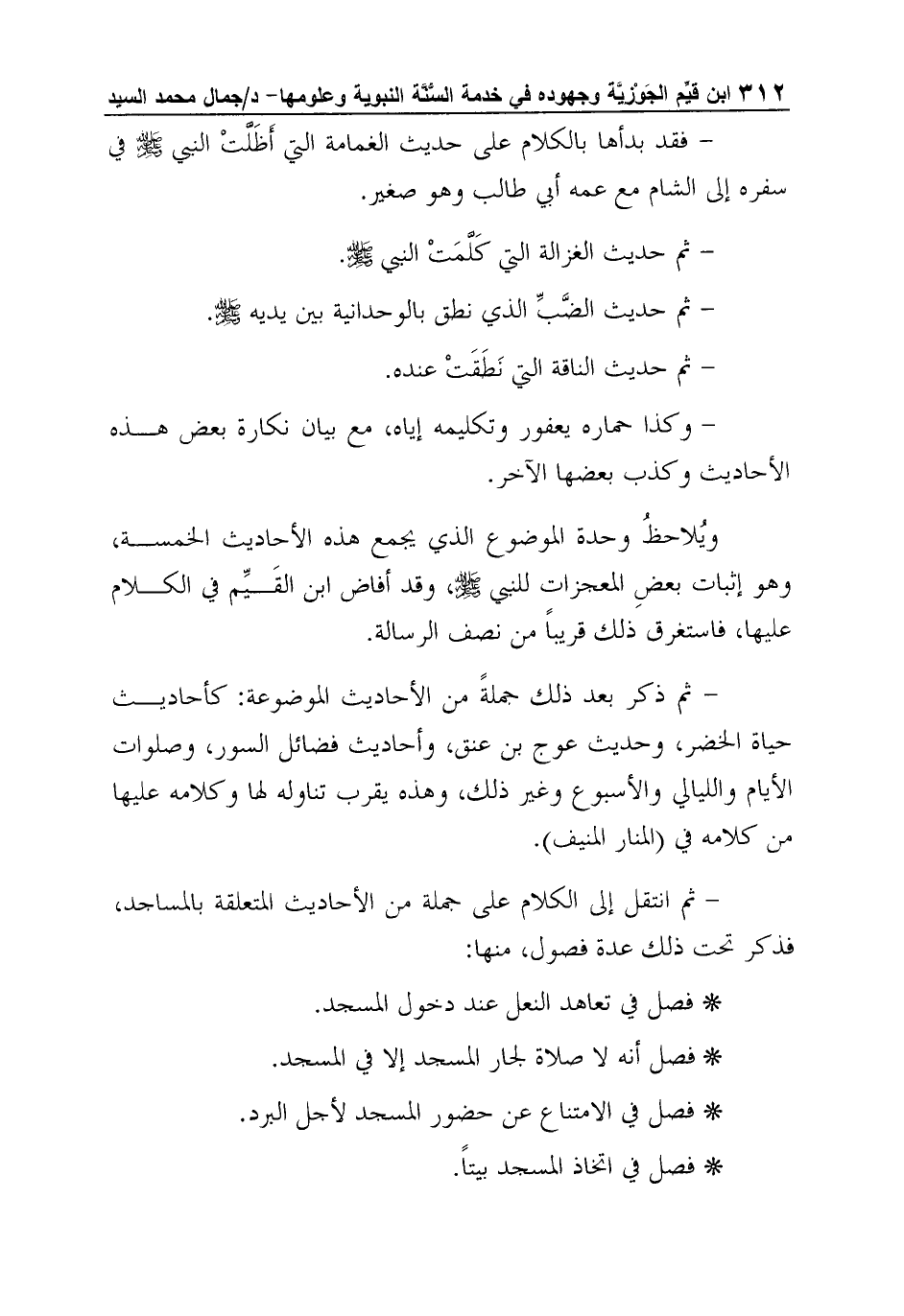 - ثم انتقل إلى الكلام على جملة من الأحاديث المتعلقة بالمساجد، فذكر تحت ذلك عدة فصول، منها: