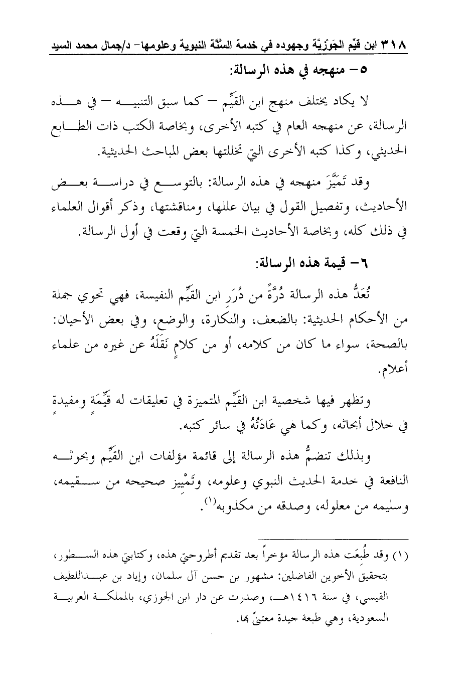 وبذلك تنضمُّ هذه الرسالة إلى قائمة مؤلفات ابن القَيِّم وبحوثه النافعة في خدمة الحديث النبوي وعلومه، وتَمْيِيز صحيحه من سقيمه، وسليمه من معلوله، وصدقه من مكذوبه1.