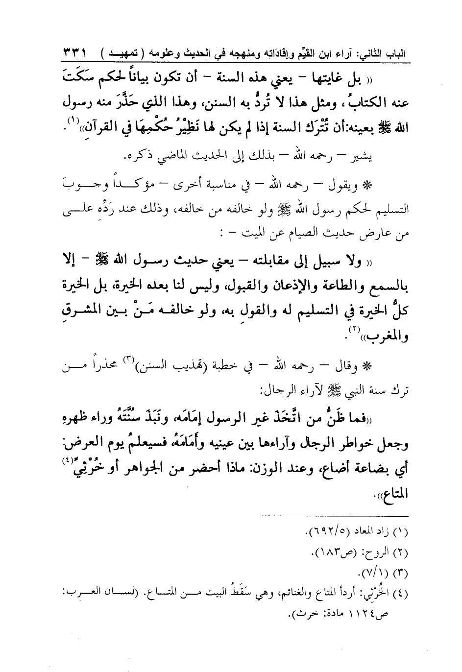 وقال - رحمه الله - في خطبة (تهذيب السنن) 3 محذراً من ترك سنة النبي صلى الله عليه وسلم لآراء الرجال: "فما ظَنُّ من اتَّخَذَ غير الرسول إمَامَه، ونَبَذَ سُنَّتَهُ وراء ظهرهِ وجعل خواطر الرجال وآراءها بين عينيه وأَمَامَهُ، فسيعلمُ يوم العرض: أي بضاعة أضاع، وعند الوزن: ماذا أحضر من الجواهر أو خُرْثِيِّ4 المتاع".