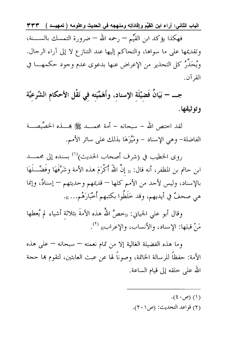 جـ - بَيَانُ فَضِيْلَةِ الإسنادِ، وأَهَمِّيَتِه فِي نَقْل الأحكامِ الشَّرعِيَّة وتوثيقها.