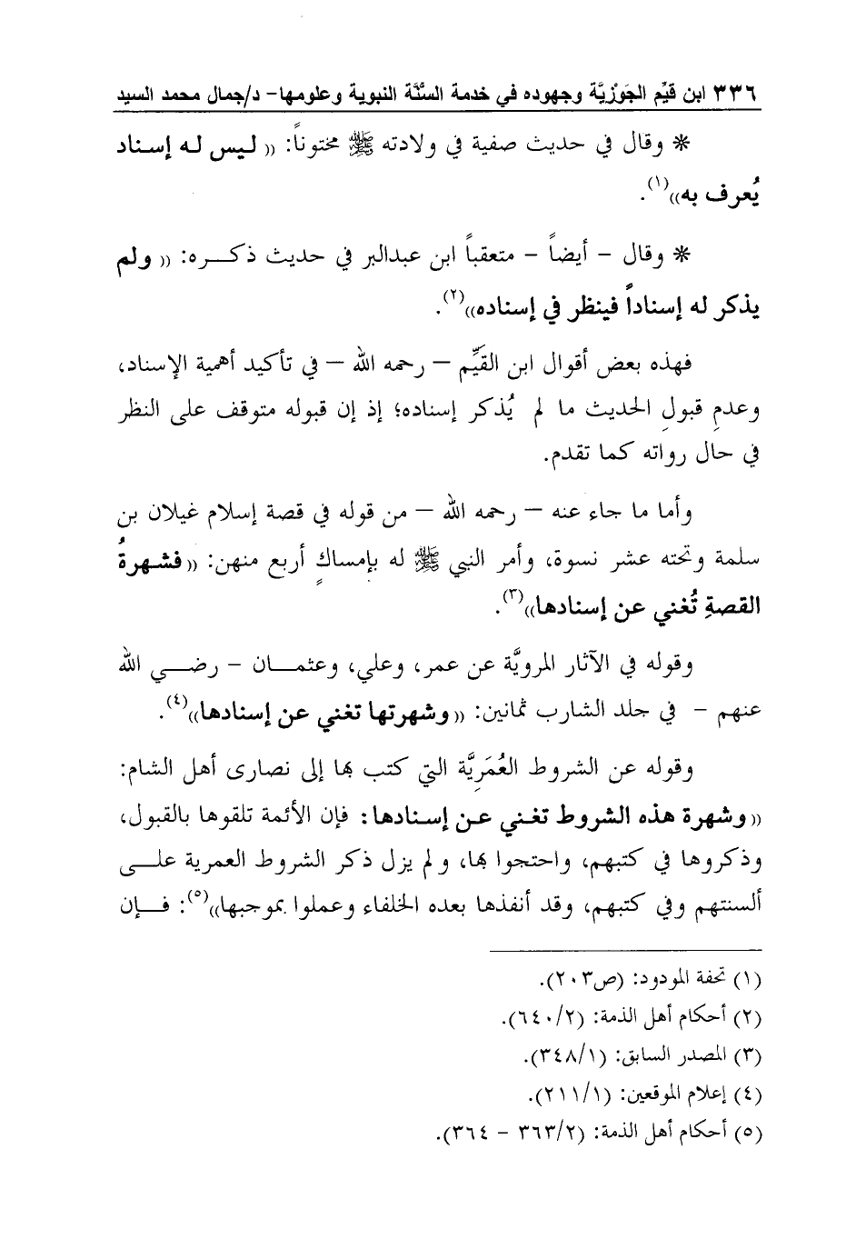 وقوله عن الشروط العُمَرِيَّة التي كتب بها إلى نصارى أهل الشام: "وشهرة هذه الشروط تغني عن إسنادها: فإن الأئمة تلقوها بالقبول، وذكروها في كتبهم، واحتجوا بها، ولم يزل ذكر الشروط العمرية على ألسنتهم وفي كتبهم، وقد أنفذها بعده الخلفاء وعملوا بموجبها"5: فإن