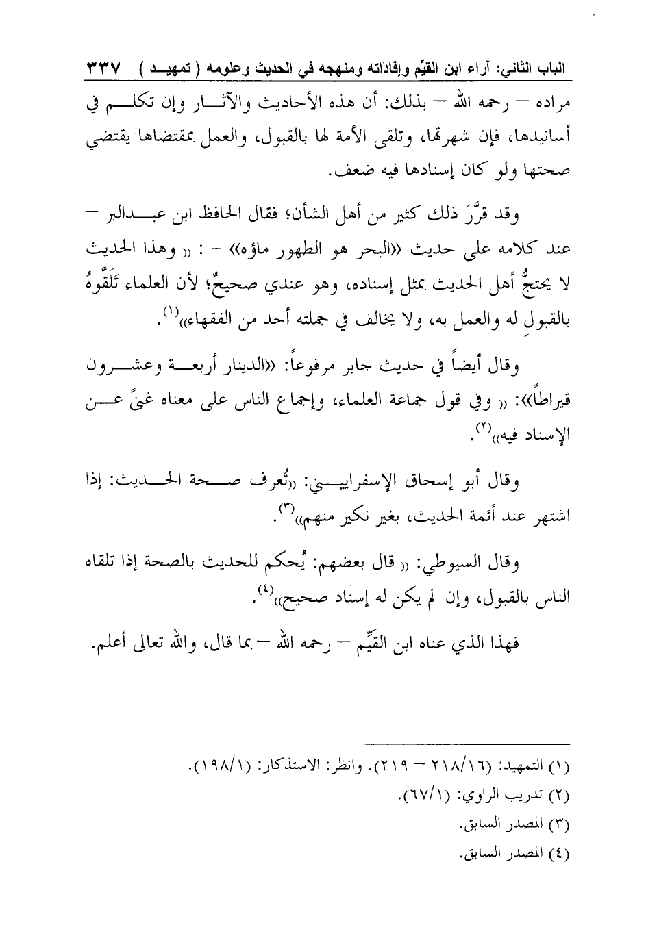 وقد قرَّرَ ذلك كثير من أهل الشأن؛ فقال الحافظ ابن عبد البر - عند كلامه على حديث "البحر هو الطهور ماؤه" -: "وهذا الحديث لا يحتجُّ أهل الحديث بمثل إسناده، وهو عندي صحيحٌ؛ لأن العلماء تَلَقَّوهُ بالقبولِ له والعمل به، ولا يخالف في جملته أحد من الفقهاء"1.