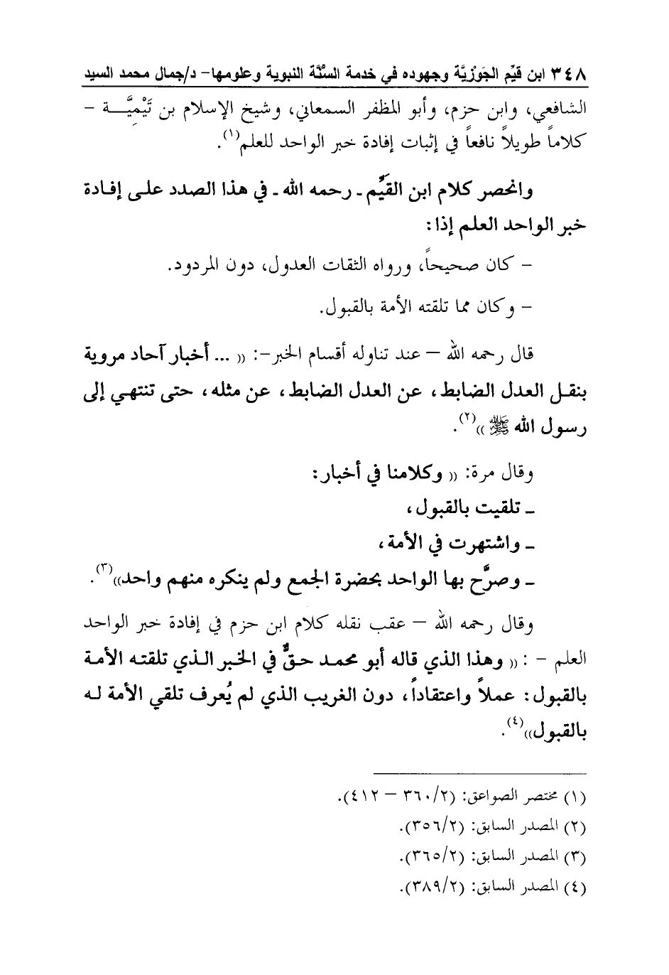 وانحصر كلام ابن القَيِّم - رحمه الله - في هذا الصدد على إفادة خبر الواحد العلم إذا: