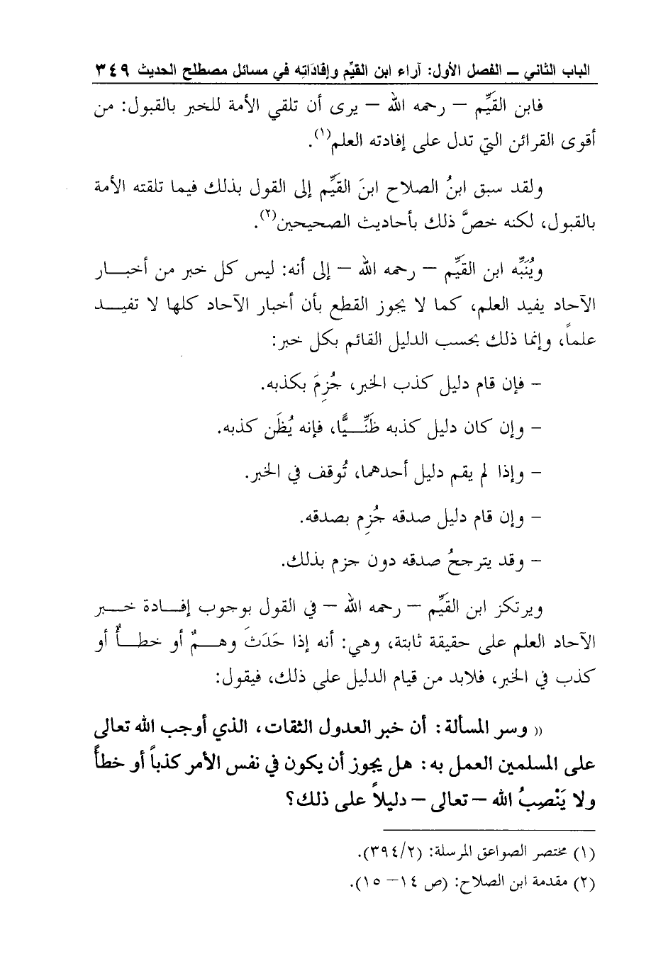 ويُنَبِّه ابن القَيِّم - رحمه الله - إلى أنه: ليس كل خبر من أخبار الآحاد يفيد العلم، كما لا يجوز القطع بأن أخبار الآحاد كلها لا تفيد علماً، وإنما ذلك بحسب الدليل القائم بكل خبر: