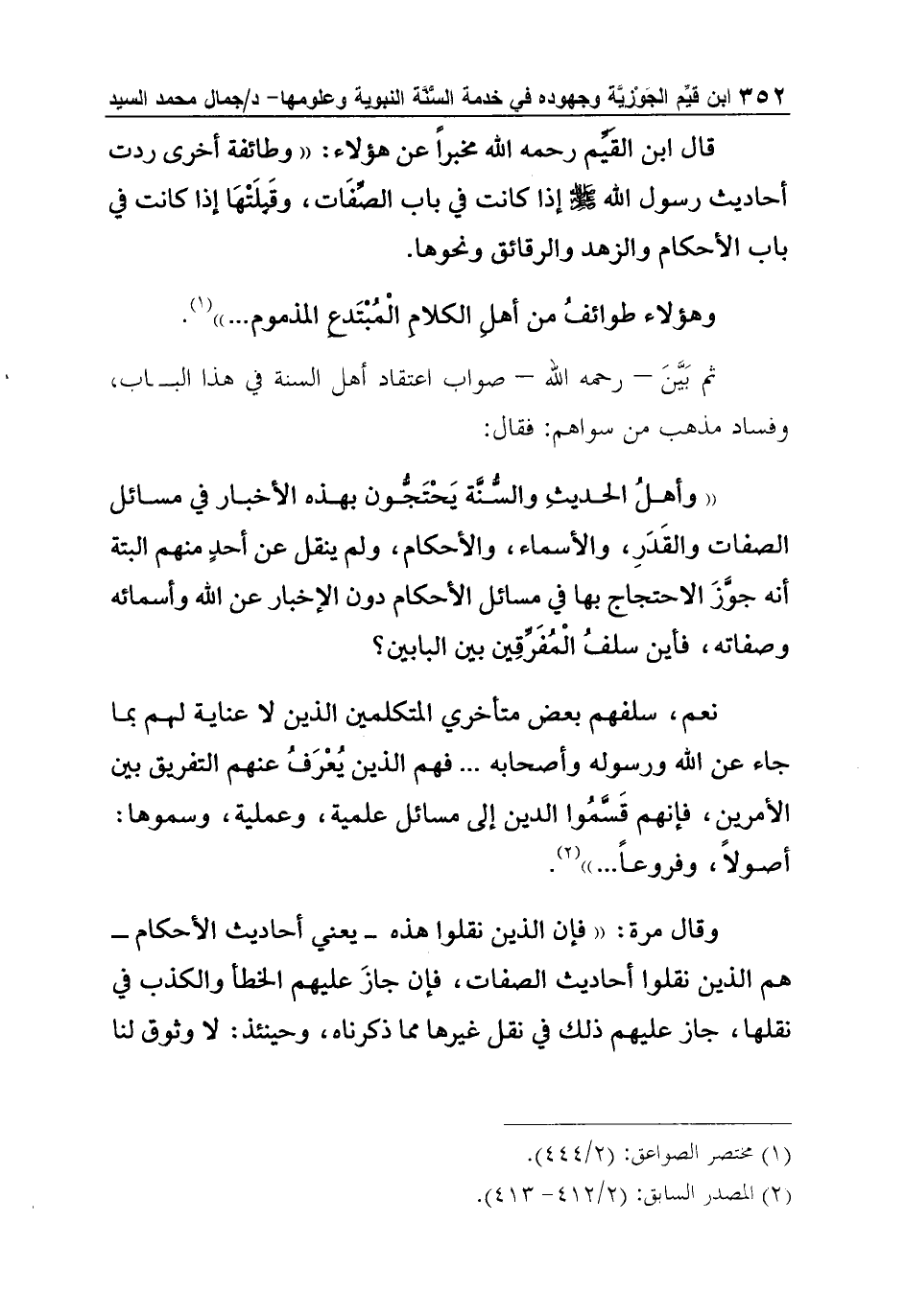 ثم بَيَّنَ - رحمه الله - صواب اعتقاد أهل السنة في هذا الباب، وفساد مذهب من سواهم: فقال: "وأهلُ الحديثِ والسُّنَّة يَحْتَجُّون بهذه الأخبار في مسائل الصفات والقَدَرِ، والأسماء، والأحكام، ولم ينقل عن أحدٍ منهم البتة أنه جوَّزَ الاحتجاج بها في مسائل الأحكام دون الإخبار عن الله وأسمائه وصفاته، فأين سلفُ الْمُفَرِّقِين بين البابين؟ نعم، سلفهم بعض متأخري المتكلمين الذين لا عناية لهم بما جاء عن الله ورسوله وأصحابه ... فهم الذين يُعْرَفُ عنهم التفريق بين الأمرين، فإنهم قَسَّمُوا الدين إلى مسائل علمية، وعملية، وسموها: أصولاً، وفروعاً ... "2.
