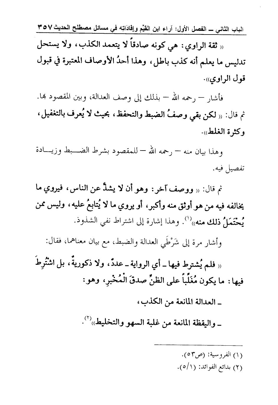 وأشار مرة إلى شَرْطَي العدالة والضبط، مع بيان معناهما، فقال: "فلم يُشترط فيها - أي الرواية - عددٌ، ولا ذكوريةٌ، بل اشْتُرِطَ فيها: ما يكون مُغَلِّباً على الظنِّ صدقَ الْمُخْبرِ، وهو: العدالة المانعة من الكذب، واليقظة المانعة من غلبة السهو والتخليط"2.