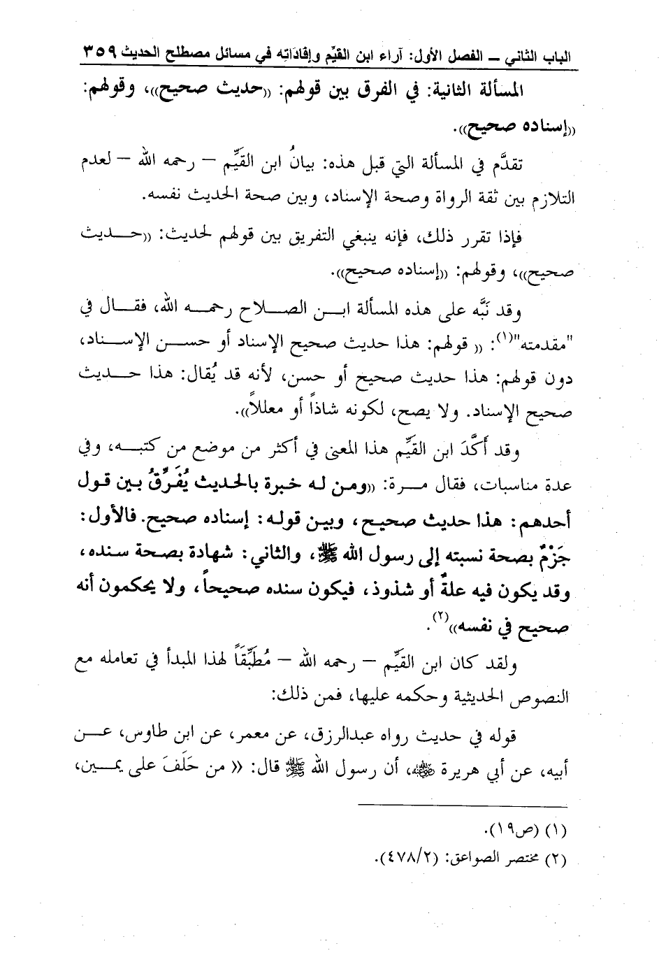 وقد أَكَّدَ ابن القَيِّم هذا المعنى في أكثر من موضع من كتبه، وفي عدة مناسبات، فقال مرة: "ومن له خبرة بالحديث يُفَرِّقُ بين قول أحدهم: هذا حديث صحيح، وبين قوله: إسناده صحيح. فالأول: جَزْمٌ بصحة نسبته إلى رسول الله صلى الله عليه وسلم، والثاني: شهادة بصحة سنده، وقد يكون فيه علةٌ أو شذوذ، فيكون سنده صحيحاً، ولا يحكمون أنه صحيح في نفسه"2.