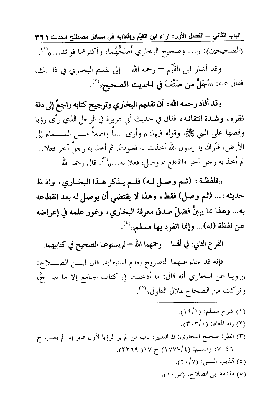 وقد أشار ابن القَيِّم - رحمه الله - إلى تقديم البخاري في ذلك، فقال عنه: "أجَلُّ من صَنَّفَ في الحديث الصحيح"2.