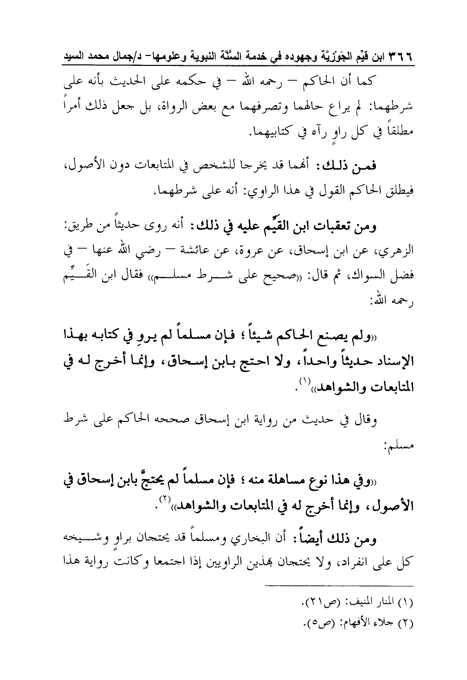 وقال في حديث من رواية ابن إسحاق صححه الحاكم على شرط مسلم: "وفي هذا نوع مساهلة منه؛ فإن مسلماً لم يحتجَّ بابن إسحاق في الأصول، وإنما أخرج له في المتابعات والشواهد"2.