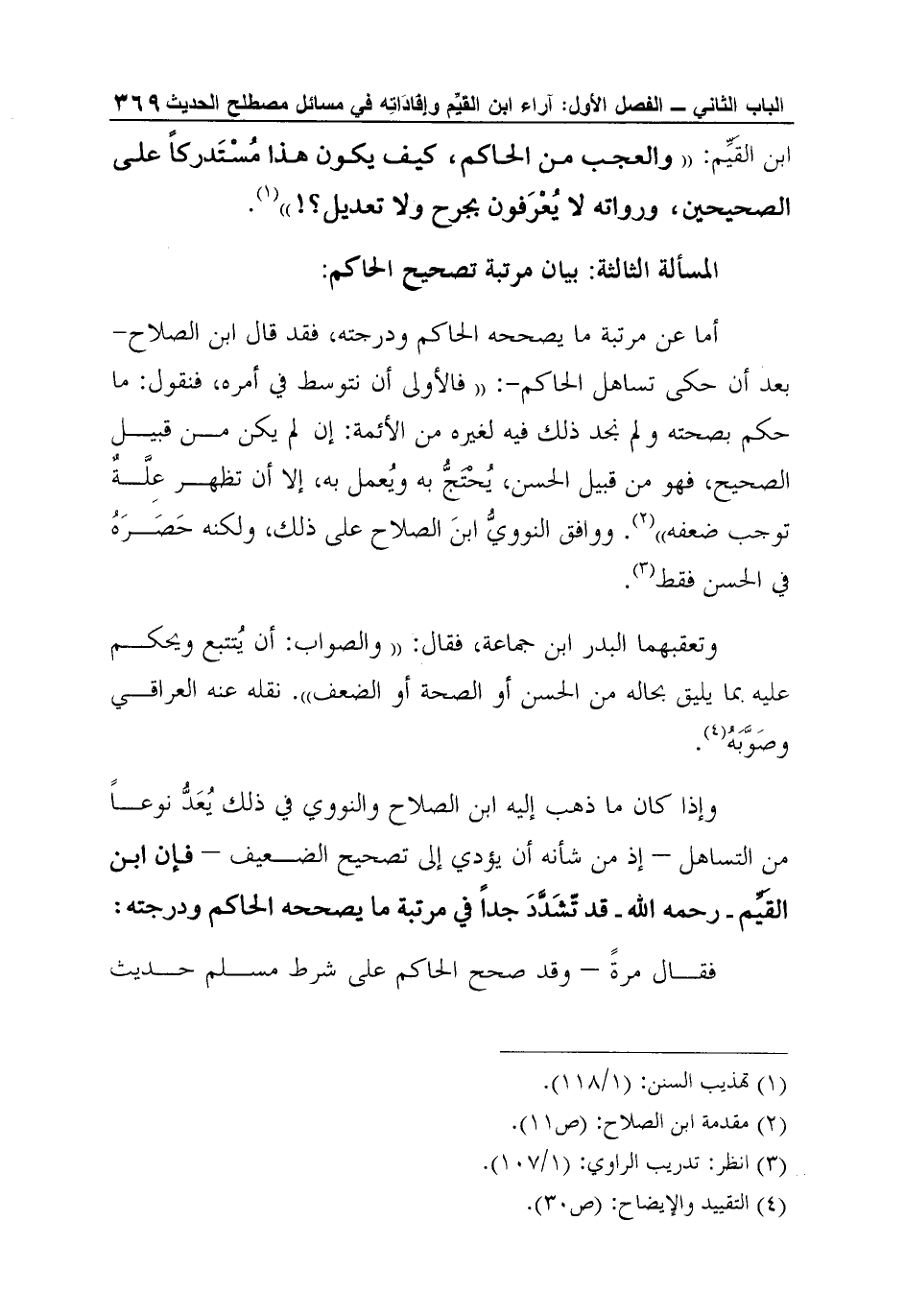وإذا كان ما ذهب إليه ابن الصلاح والنووي في ذلك يُعَدُّ نوعاً من التساهل - إذ من شأنه أن يؤدي إلى تصحيح الضعيف - فإن ابن القَيِّم - رحمه الله - قد تّشَدَّدَ جداً في مرتبة ما يصححه الحاكم ودرجته: