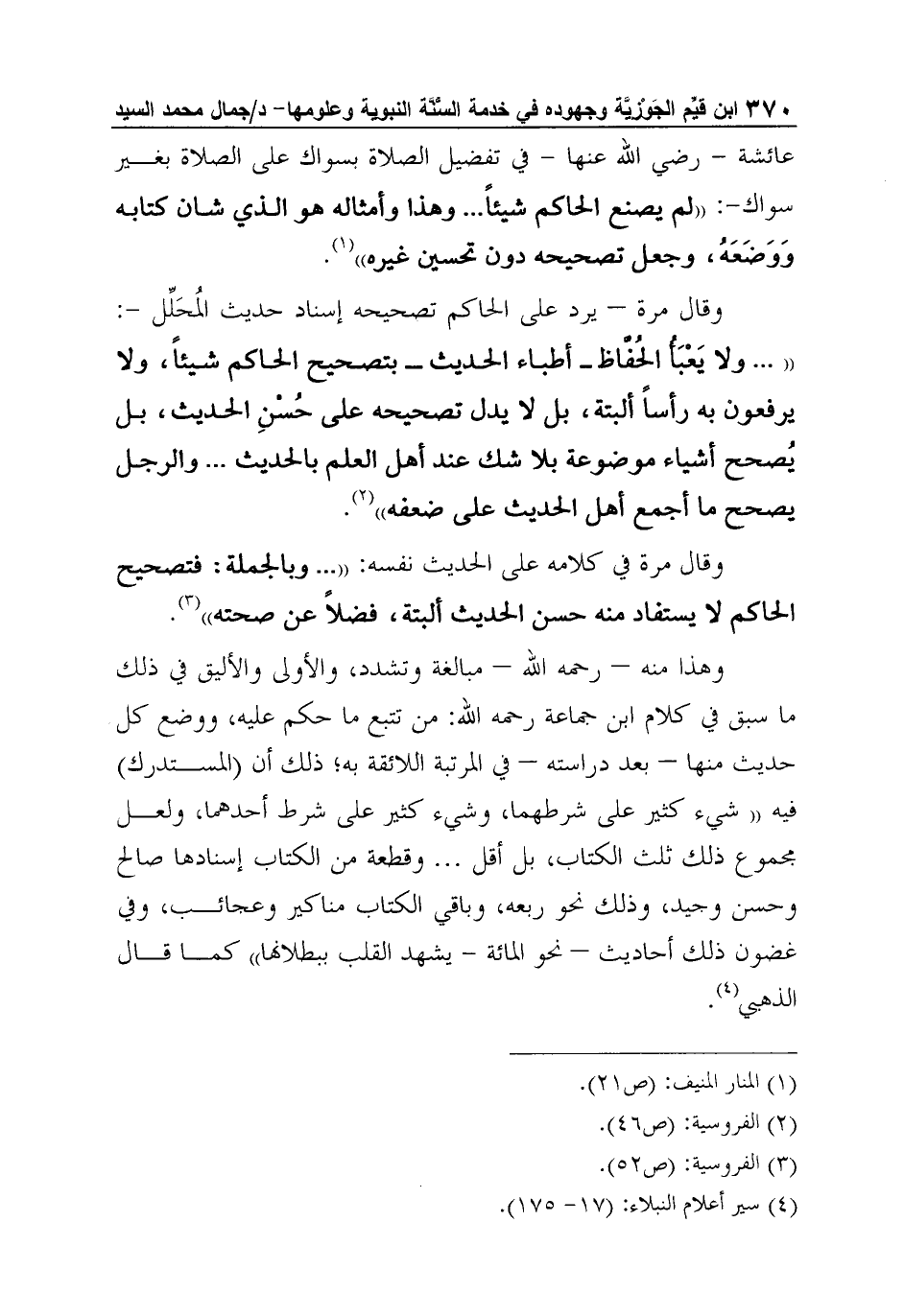 عائشة - رضي الله عنها - في تفضيل الصلاة بسواك على الصلاة بغير سواك-: "لم يصنع الحاكم شيئاً ... وهذا وأمثاله هو الذي شان كتابه وَوَضَعَهُ، وجعل تصحيحه دون تحسين غيره"1.