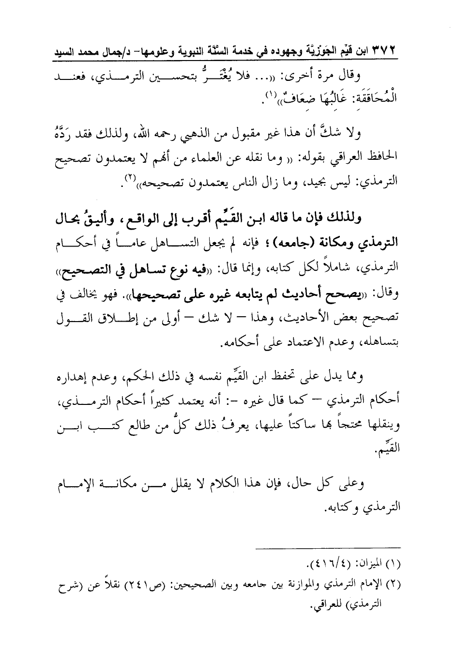 ولذلك فإن ما قاله ابن القَيِّم أقرب إلى الواقع، وأليقُ بحال الترمذي ومكانة (جامعه) ؛ فإنه لم يجعل التساهل عاماً في أحكام الترمذي، شاملاً لكل كتابه، وإنما قال: "فيه نوع تساهل في التصحيح" وقال: "يصحح أحاديث لم يتابعه غيره على تصحيحها". فهو يخالف في تصحيح بعض الأحاديث، وهذا - لا شك - أولى من إطلاق القول بتساهله، وعدم الاعتماد على أحكامه.