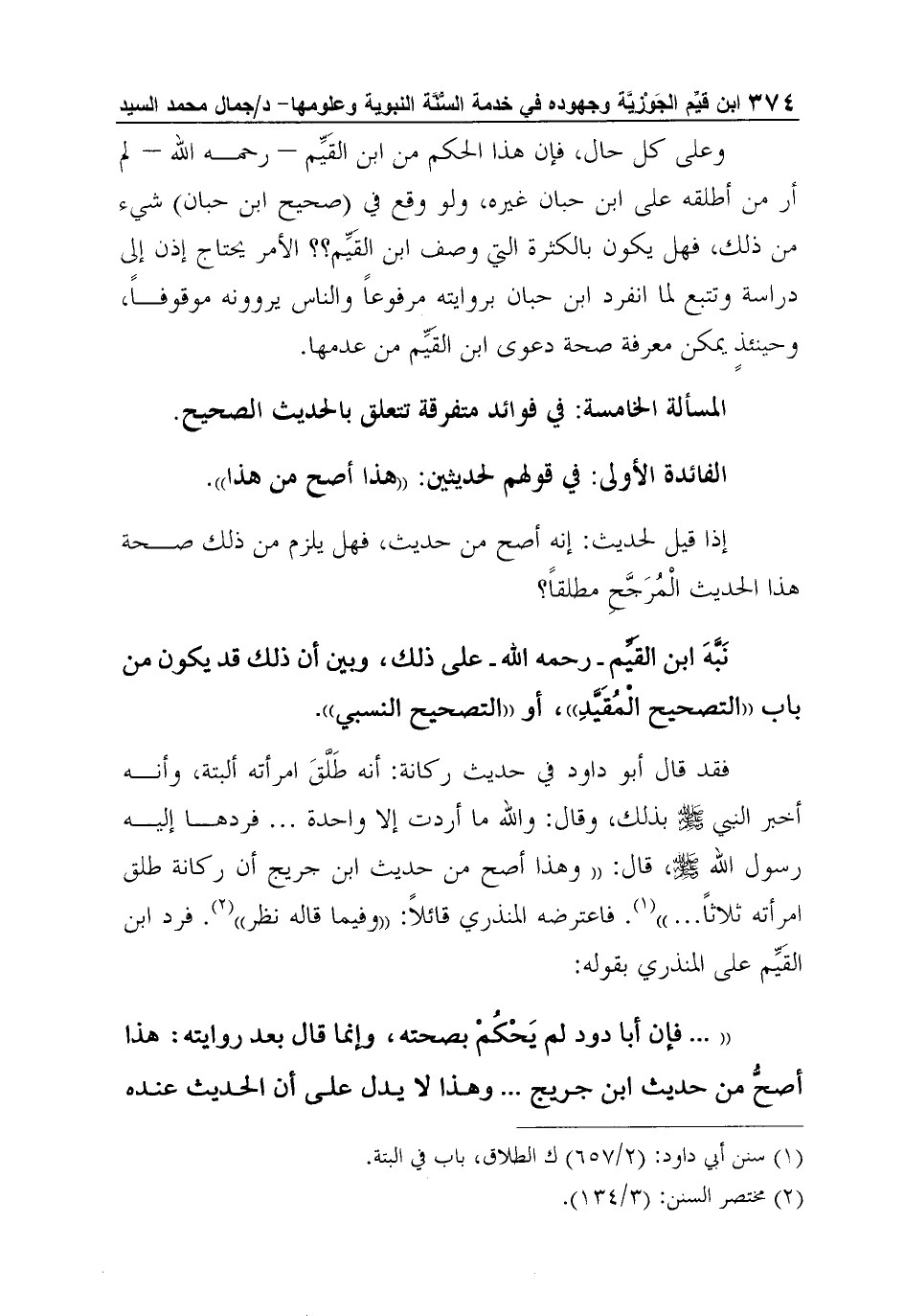 فقد قال أبو داود في حديث ركانة: أنه طَلَّقَ امرأته ألبتة، وأنه أخبر النبي صلى الله عليه وسلم بذلك، وقال: والله ما أردت إلا واحدة ... فردها إليه رسول الله صلى الله عليه وسلم، قال: "وهذا أصح من حديث ابن جريج أن ركانة طلق امرأته ثلاثاً ... "1. فاعترضه المنذري قائلاً: "وفيما قاله نظر"2. فرد ابن القَيِّم على المنذري بقوله: " ... فإن أبا دود لم يَحْكُمْ بصحته، وإنما قال بعد روايته: هذا أصحُّ من حديث ابن جريج ... وهذا لا يدل على أن الحديث عنده