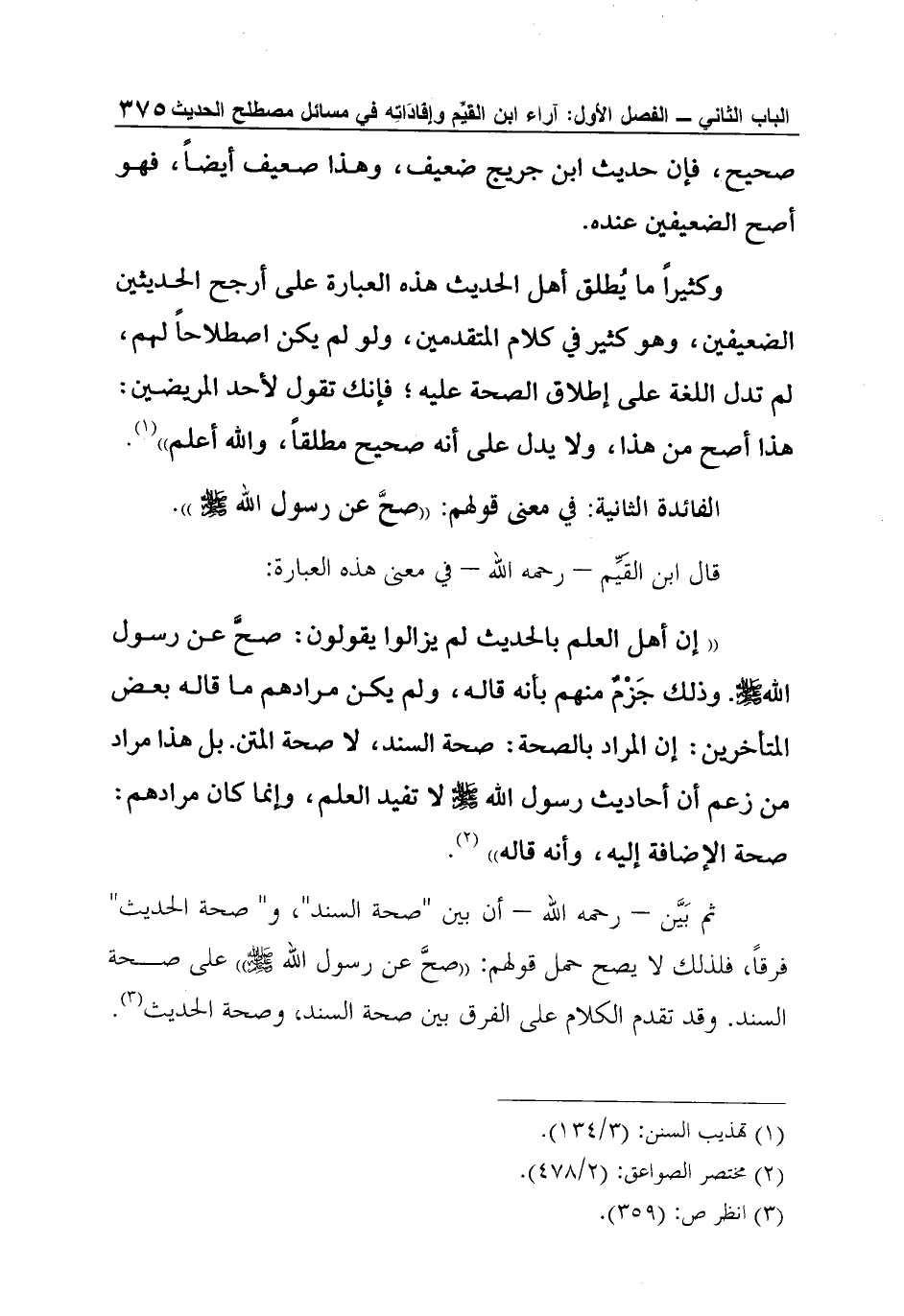 قال ابن القَيِّم - رحمه الله - في معنى هذه العبارة: "إن أهل العلم بالحديث لم يزالوا يقولون: صحَّ عن رسول الله صلى الله عليه وسلم. وذلك جَزْمٌ منهم بأنه قاله، ولم يكن مرادهم ما قاله بعض المتأخرين: إن المراد بالصحة: صحة السند، لا صحة المتن. بل هذا مراد من زعم أن أحاديث رسول الله صلى الله عليه وسلم لا تفيد العلم، وإنما كان مرادهم: صحة الإضافة إليه، وأنه قاله"2.