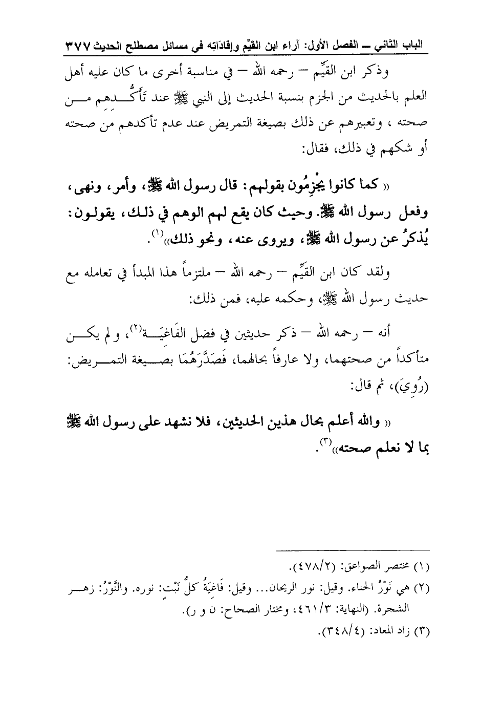 وذكر ابن القَيِّم - رحمه الله - في مناسبة أخرى ما كان عليه أهل العلم بالحديث من الجزم بنسبة الحديث إلى النبي صلى الله عليه وسلم عند تَأَكُّدِهِم من صحته، وتعبيرهم عن ذلك بصيغة التمريض عند عدم تأكدهم من صحته أو شكهم في ذلك، فقال: