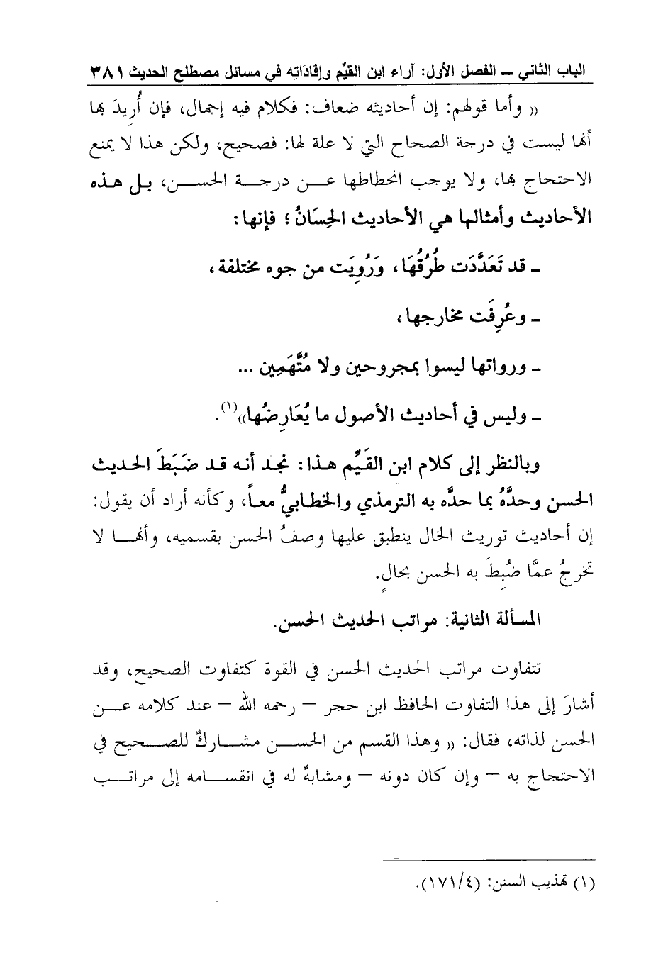 وبالنظر إلى كلام ابن القَيِّم هذا: نجد أنه قد ضَبَطَ الحديث الحسن وحدَّهُ بما حدَّه به الترمذي والخطابيُّ معاً، وكأنه أراد أن يقول: إن أحاديث توريث الخال ينطبق عليها وصفُ الحسن بقسميه، وأنها لا تخرجُ عمَّا ضُبِطَ به الحسن بحالٍ.