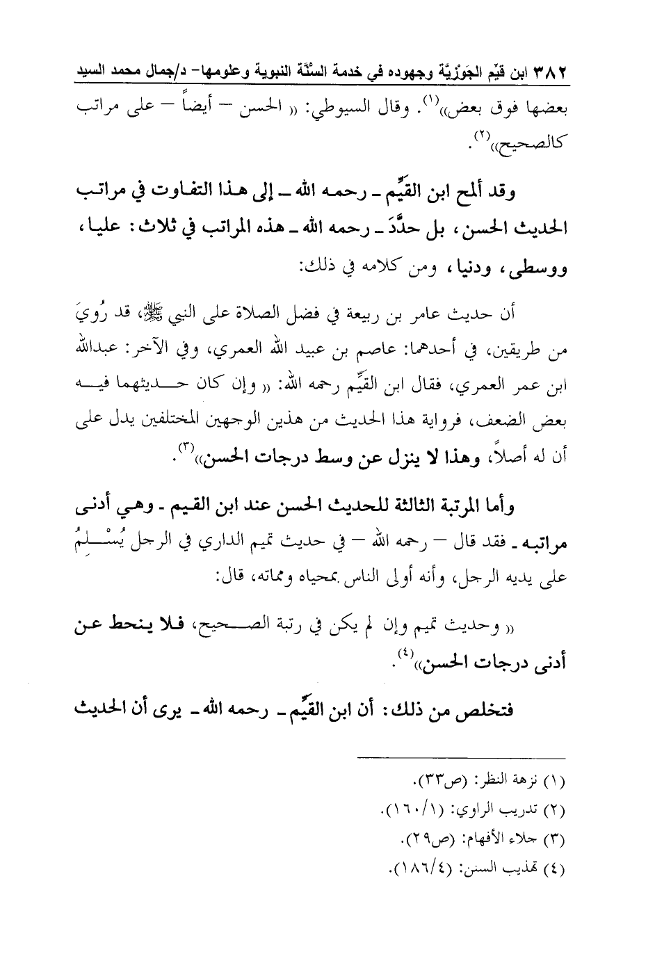 وقد ألمح ابن القَيِّم - رحمه الله - إلى هذا التفاوت في مراتب الحديث الحسن، بل حدَّدَ - رحمه الله - هذه المراتب في ثلاث: عليا، ووسطى، ودنيا، ومن كلامه في ذلك: