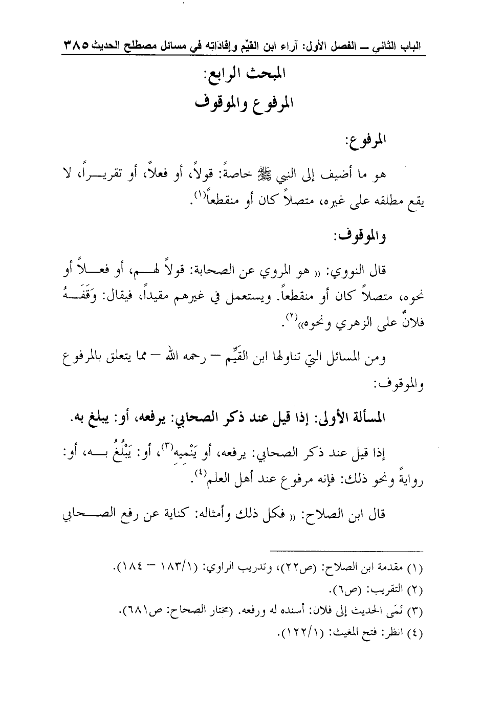 ومن المسائل التي تناولها ابن القَيِّم - رحمه الله - مما يتعلق بالمرفوع والموقوف: