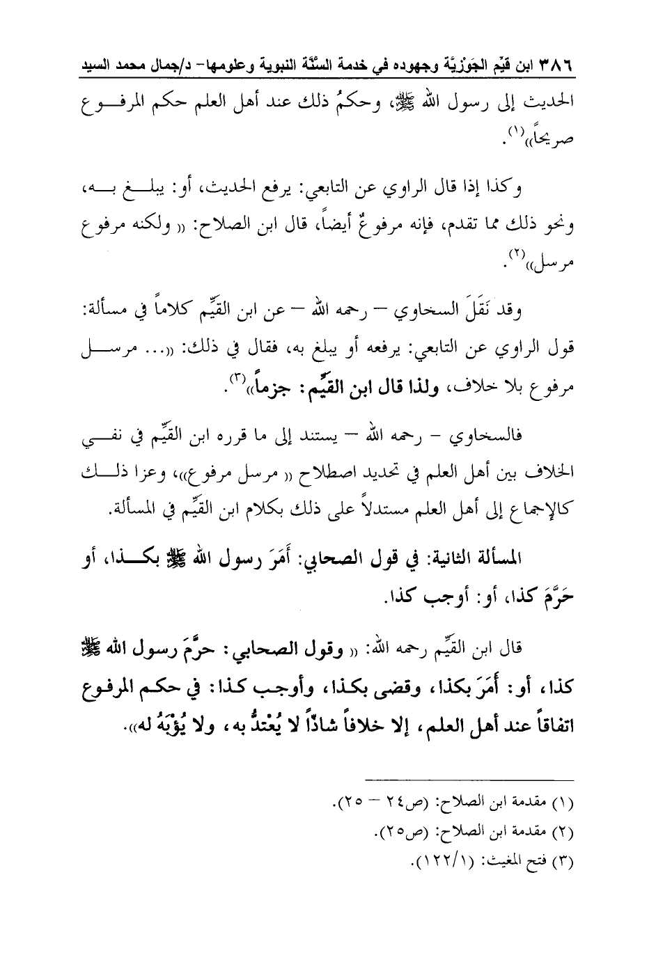وقد نَقَلَ السخاوي - رحمه الله - عن ابن القَيِّم كلاماً في مسألة: قول الراوي عن التابعي: يرفعه أو يبلغ به، فقال في ذلك: " ... مرسل مرفوع بلا خلاف، ولذا قال ابن القَيِّم: جزماً"3.