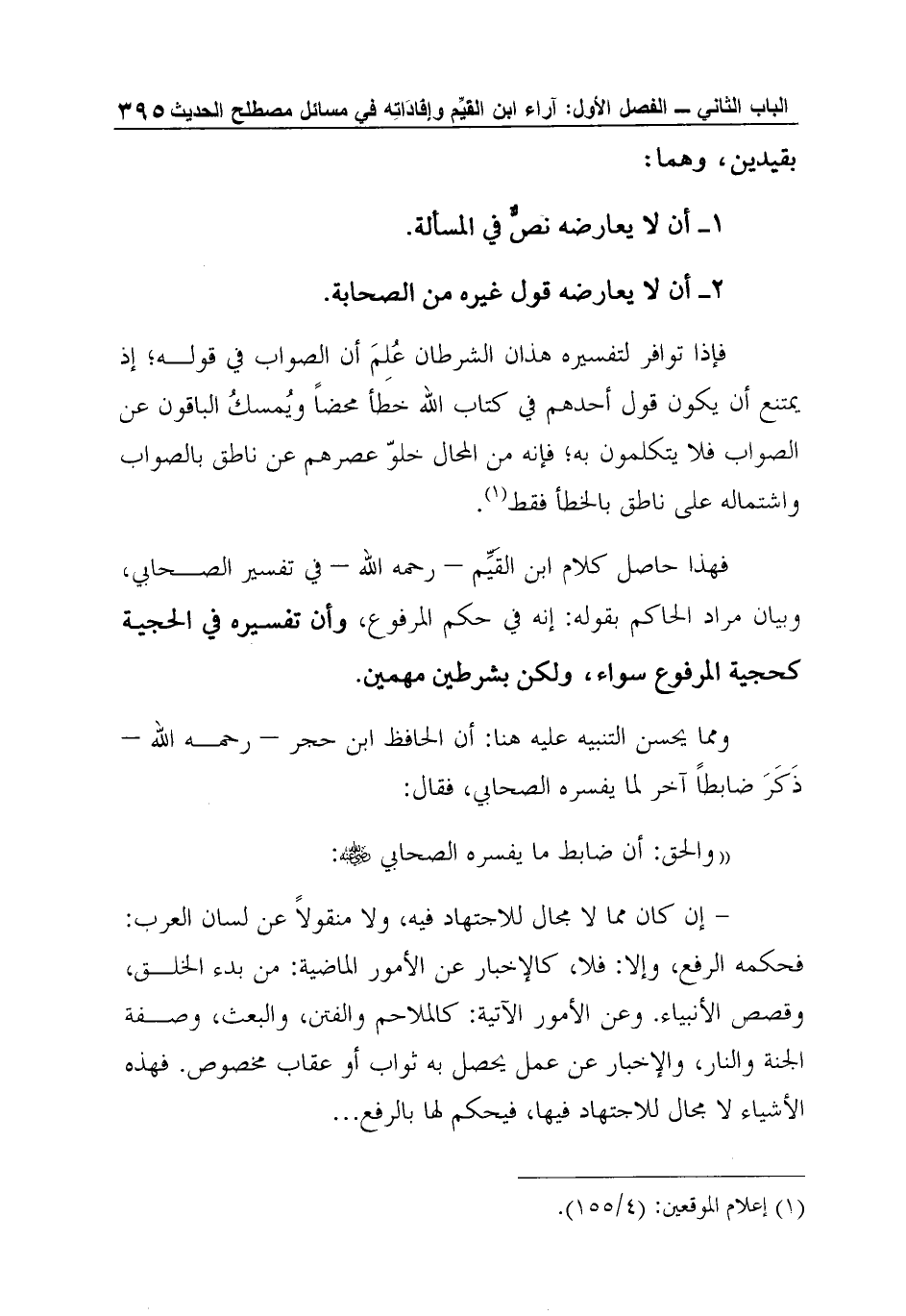فهذا حاصل كلام ابن القَيِّم - رحمه الله - في تفسير الصحابي، وبيان مراد الحاكم بقوله: إنه في حكم المرفوع، وأن تفسيره في الحجية كحجية المرفوع سواء، ولكن بشرطين مهمين.