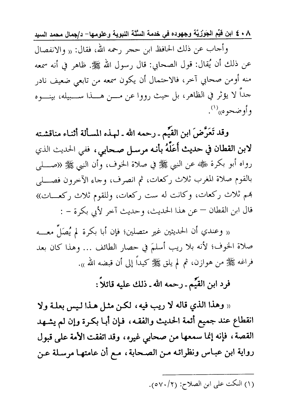 وقد تَعَرَّضَ ابن القَيِّم - رحمه الله - لهذه المسألة أثناء مناقشته لابن القطان في حديث أَعَلَّهُ بأنه مرسل صحابي، ففي الحديث الذي رواه أبو بكرة رضي الله عنه عن النبي صلى الله عليه وسلم في صلاة الخوف، وأن النبي صلى الله عليه وسلم "صلى بالقوم صلاة المغرب ثلاث ركعات، ثم انصرف، وجاء الآخرون فصلى بهم ثلاث ركعات، وكانت له ست ركعات، وللقوم ثلاث ركعات" قال ابن القطان - عن هذا الحديث، وحديث آخر لأبي بكرة -: "وعندي أن الحديثين غير متصلين؛ فإن أبا بكرة لم يُصَلِّ معه صلاة الخوف؛ لأنه بلا ريب أسلمَ في حصار الطائف ... وهذا كان بعد فراغه صلى الله عليه وسلم من هوازن، ثم لم يلق صلى الله عليه وسلم كيداً إلى أن قبضه الله".