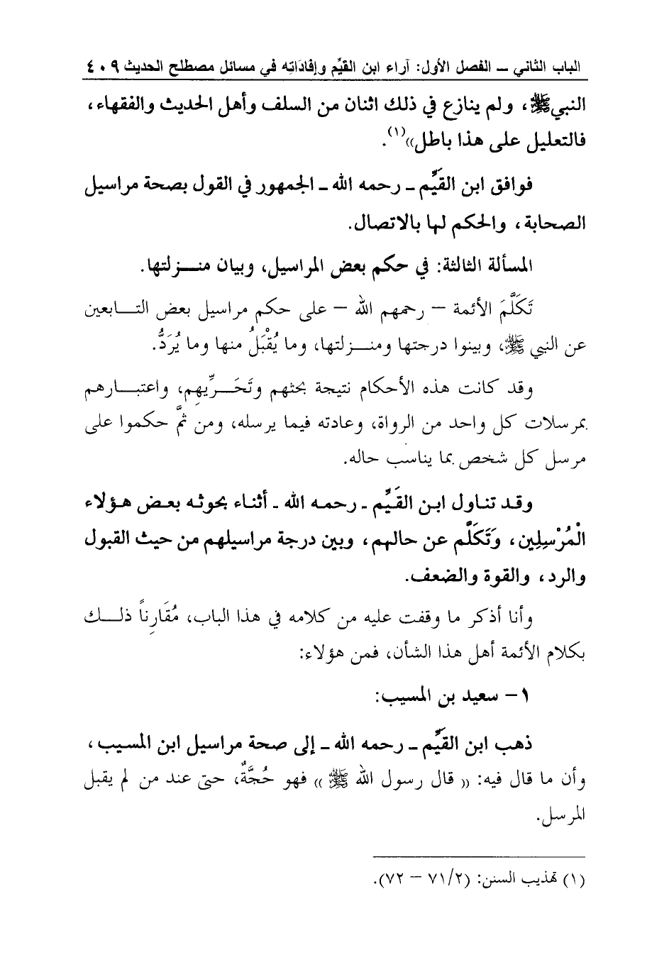 ذهب ابن القَيِّم - رحمه الله - إلى صحة مراسيل ابن المسيب، وأن ما قال فيه: "قال رسول الله صلى الله عليه وسلم" فهو حُجَّةٌ، حتى عند من لم يقبل المرسل.