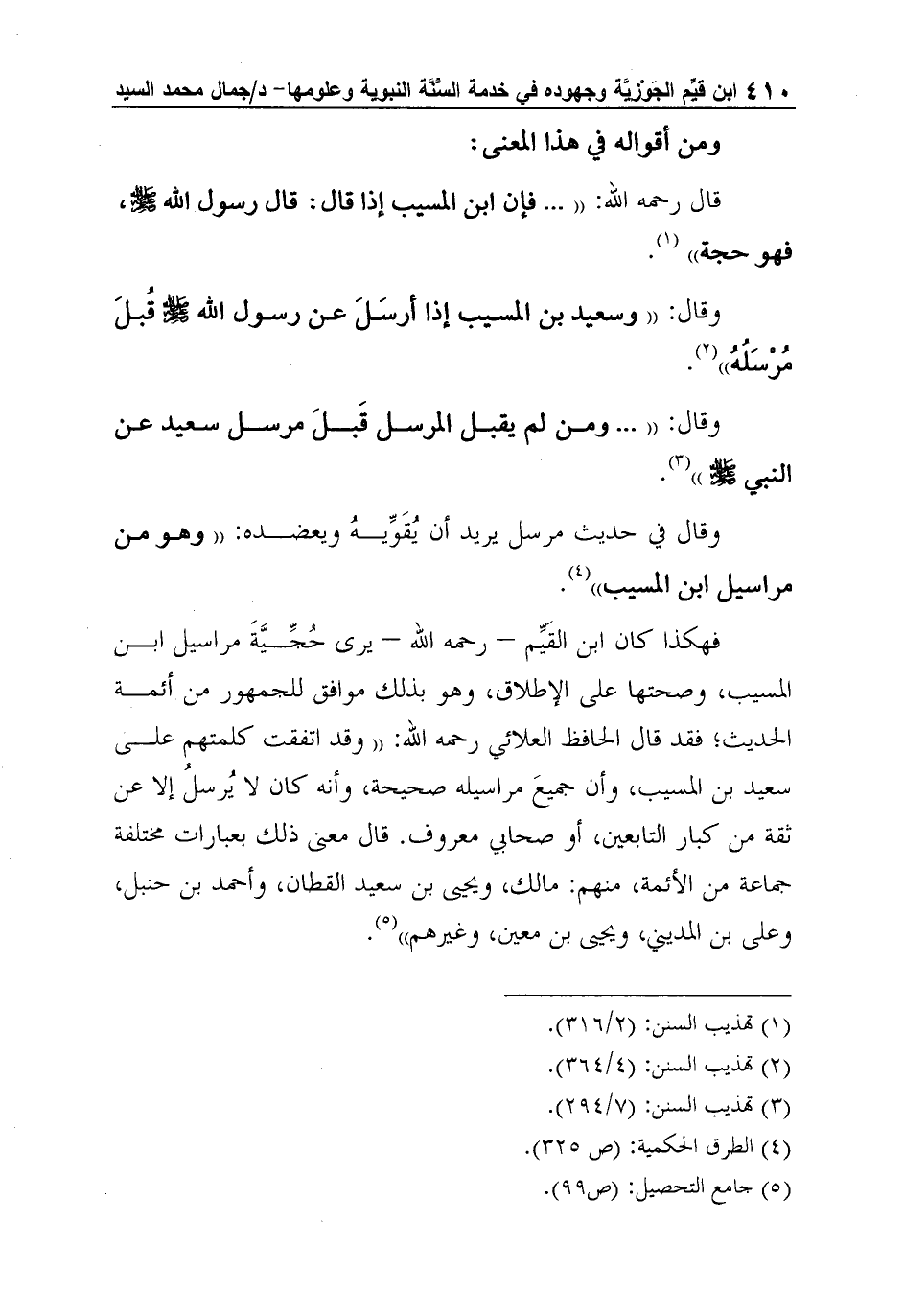 فهكذا كان ابن القَيِّم - رحمه الله - يرى حُجِّيَّةَ مراسيل ابن المسيب، وصحتها على الإطلاق، وهو بذلك موافق للجمهور من أئمة الحديث؛ فقد قال الحافظ العلائي رحمه الله: "وقد اتفقت كلمتهم على سعيد بن المسيب، وأن جميعَ مراسيله صحيحة، وأنه كان لا يُرسلُ إلا عن ثقة من كبار التابعين، أو صحابي معروف. قال معنى ذلك بعبارات مختلفة جماعة من الأئمة، منهم: مالك، ويحيى بن سعيد القطان، وأحمد بن حنبل، وعلى بن المديني، ويحيى بن معين، وغيرهم"5.