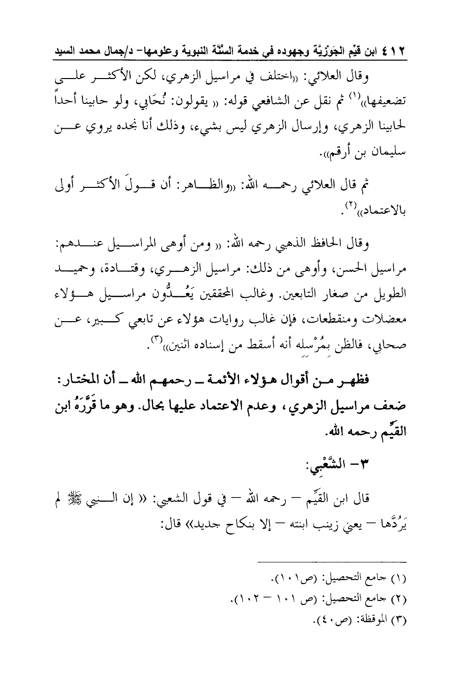 وقال العلائي: "اختلف في مراسيل الزهري، لكن الأكثر على تضعيفها"1 ثم نقل عن الشافعي قوله: "يقولون: نُحَابي، ولو حابينا أحداً لحابينا الزهري، وإرسال الزهري ليس بشيء، وذلك أنا نجده يروي عن سليمان بن أرقم".