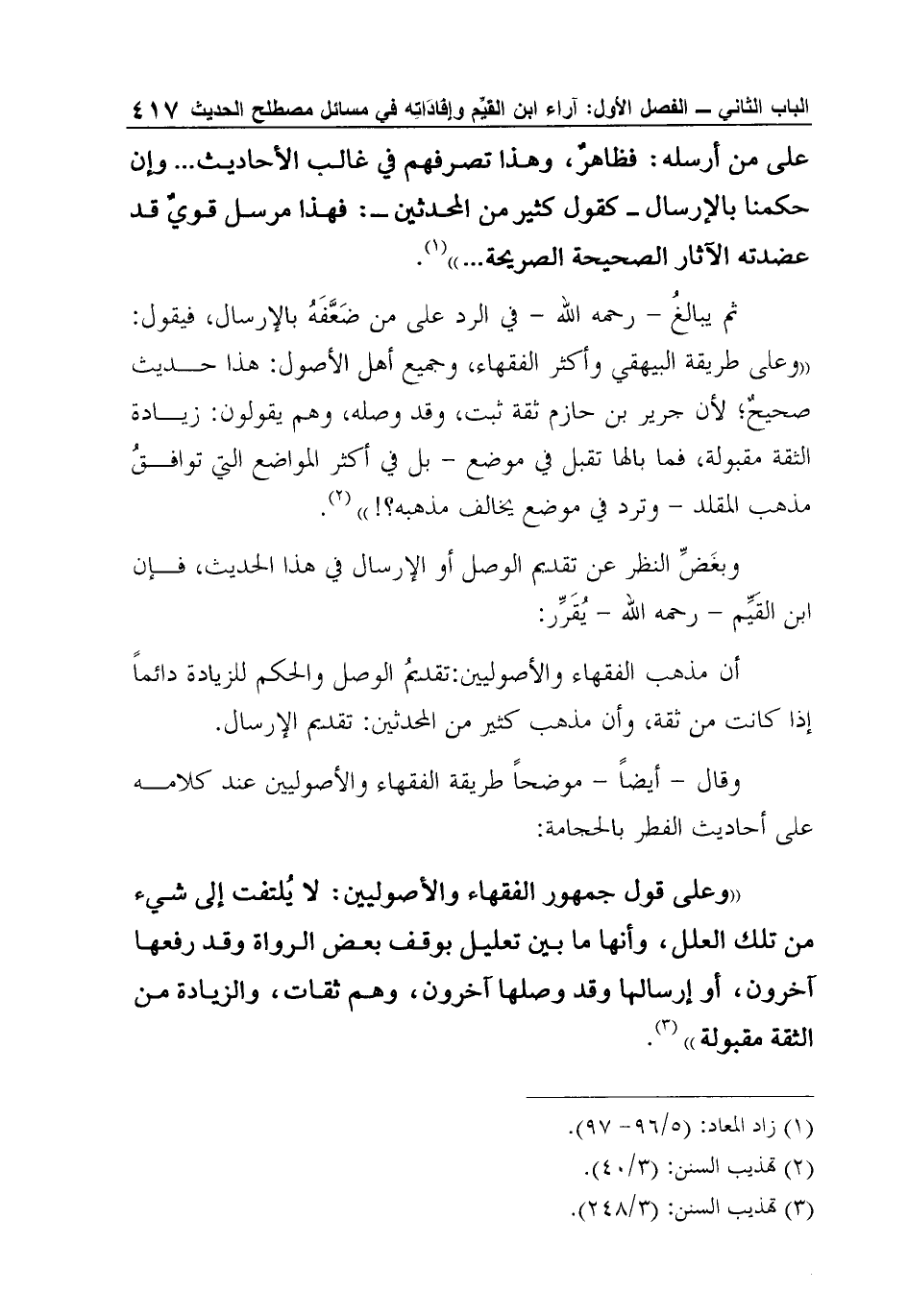 وبغَضِّ النظر عن تقديم الوصل أو الإرسال في هذا الحديث، فإن ابن القَيِّم - رحمه الله - يُقَرِّر: أن مذهب الفقهاء والأصوليين: تقديمُ الوصل والحكم للزيادة دائماً إذا كانت من ثقة، وأن مذهب كثير من المحدثين: تقديم الإرسال.