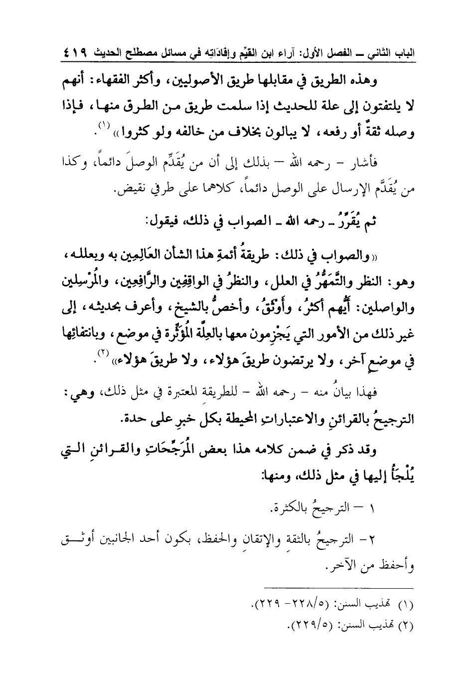 ثم يُقَرِّرُ - رحمه الله - الصواب في ذلك، فيقول: "والصواب في ذلك: طريقةُ أئمةِ هذا الشأن العَالِمِين به وبعلله، وهو: النظر والتَّمَهُّرُ في العلل، والنظرُ في الواقِفِين والرَّافِعِين، والمُرْسِلين والواصلين: أَيُّهم أكثرُ، وأَوْثَقُ، وأخصُّ بالشيخ، وأعرف بحديثه، إلى غير ذلك من الأمور التي يَجْزِمون معها بالعِلَّة المُؤَثِّرة في موضع، وبانتفائِها في موضعٍ آخر، ولا يرتضون طريقَ هؤلاء، ولا طريقَ هؤلاء"2.