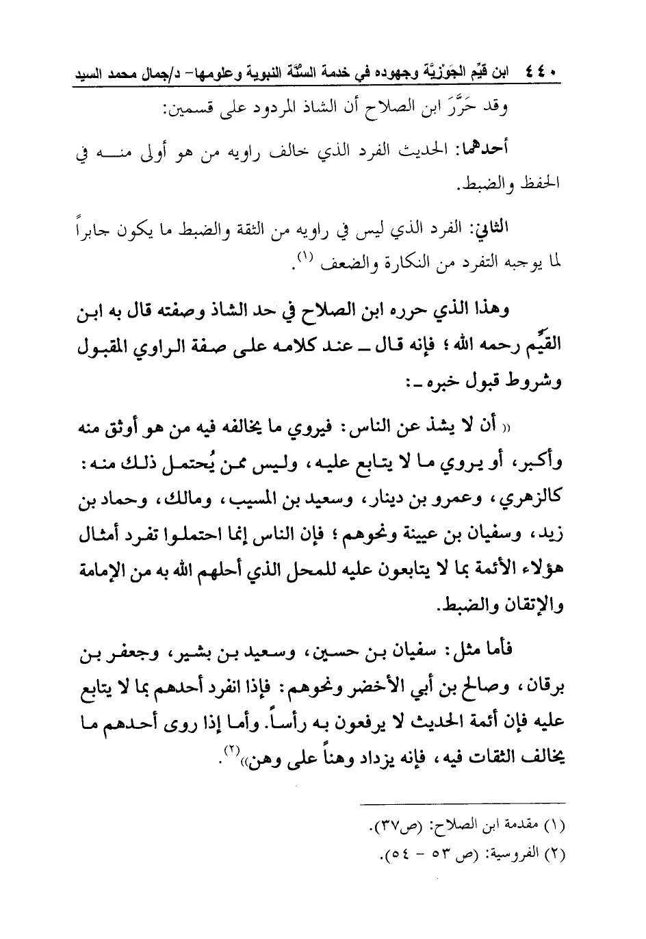 وهذا الذي حرره ابن الصلاح في حد الشاذ وصفته قال به ابن القَيِّم رحمه الله؛ فإنه قال - عند كلامه على صفة الراوي المقبول وشروط قبول خبره -: "أن لا يشذ عن الناس: فيروي ما يخالفه فيه من هو أوثق منه وأكبر، أو يروي ما لا يتابع عليه، وليس ممن يُحتمل ذلك منه: كالزهري، وعمرو بن دينار، وسعيد بن المسيب، ومالك، وحماد بن زيد، وسفيان بن عيينة ونحوهم؛ فإن الناس إنما احتملوا تفرد أمثال هؤلاء الأئمة بما لا يتابعون عليه للمحل الذي أحلهم الله به من الإمامة والإتقان والضبط.