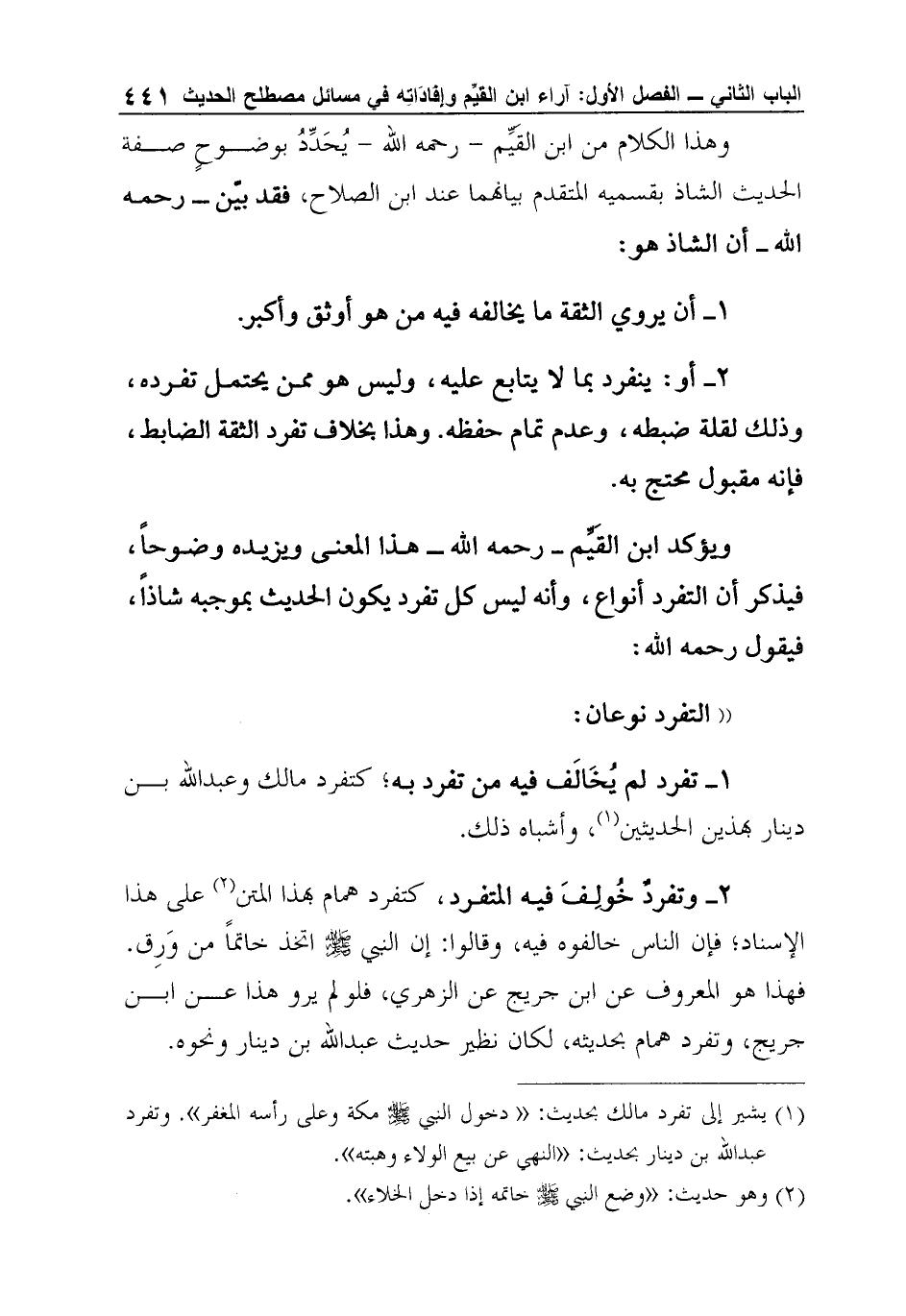 وهذا الكلام من ابن القَيِّم - رحمه الله - يُحَدِّدُ بوضوحٍ صفة الحديث الشاذ بقسميه المتقدم بيانهما عند ابن الصلاح، فقد بيّن - رحمه الله - أن الشاذ هو: