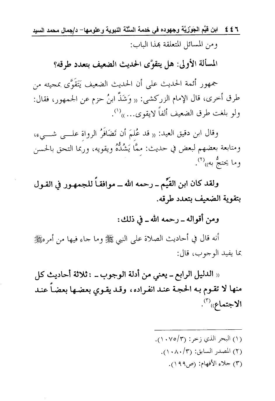ولقد كان ابن القَيِّم - رحمه الله - موافقاً للجمهور في القول بتقوية الضعيف بتعدد طرقه.