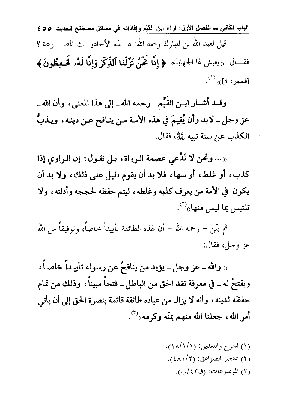 وقد أشار ابن القَيِّم - رحمه الله - إلى هذا المعنى، وأن الله - عز وجل - لابد وأن يُقِيمَ في هذه الأمة من ينافح عن دينه، ويذبُّ الكذب عن سنة نبيه صلى الله عليه وسلم، فقال: " ... ونحن لا نَدَّعي عصمة الرواة، بل نقول: إن الراوي إذا كذب، أو غلط، أو سها، فلا بد أن يقوم دليل على ذلك، ولا بد أن يكون في الأمة من يعرف كذبه وغلطه، ليتم حفظه لحججه وأدلته، ولا تلتبس بما ليس منها"2.