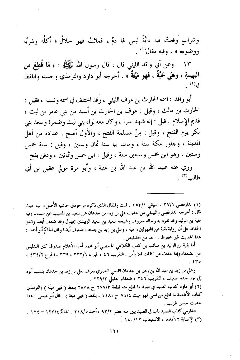 (¬2) أبو داود كتاب الصيد في صيد ما قطع منه قطعة 3/ 277 ح 2858 بلفظ (فهي ميتة) والترمذي كتاب الأطعمة ما قطع من الحي فهو ميت 4/ 74 ح 1480، بلفظ (فهي ميتة). قال أبو عيسى: هذا حديث حسن غريب.