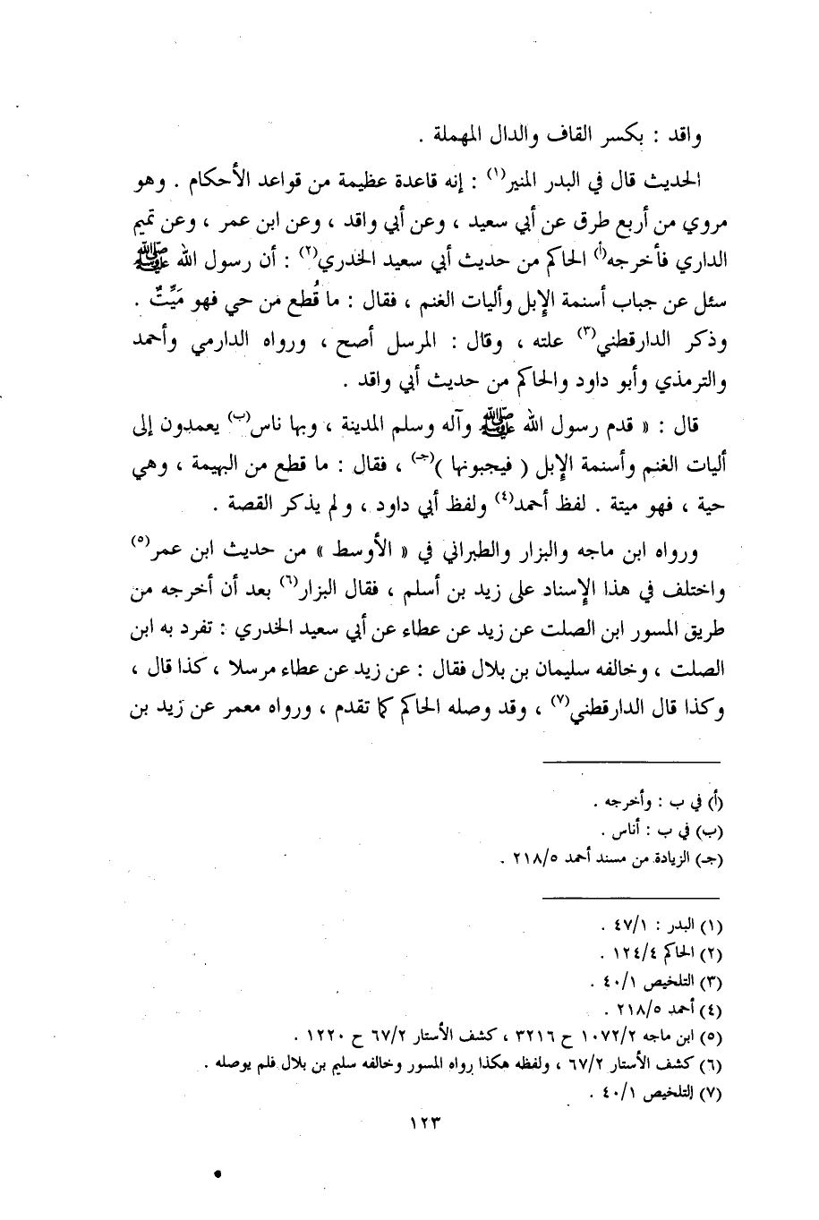 الحديث قال في البدر المنير (¬1): إنه قاعدة عطمة من قواعد الأحكام. وهو مروي من أربع طرق عن أبي سعيد، وعن أبي واقد، وعن ابن عمر، وعن تميم الداري فأخرجه (أ) الحاكم من حديث أبي سعيد الخدري (¬2): أن رسول الله - صلى الله عليه وسلم - سئل عن جباب أسنمة الإبل وأليات الغنم، فقال: ما قُطع من حي فهو مَيِّتٌ. وذكر الدارقطني (¬3) علته، وقال: المرسل أصح، ورواه الدارمي وأحمد والترمذي وأبو داود والحاكم من حديث أبي واقد.