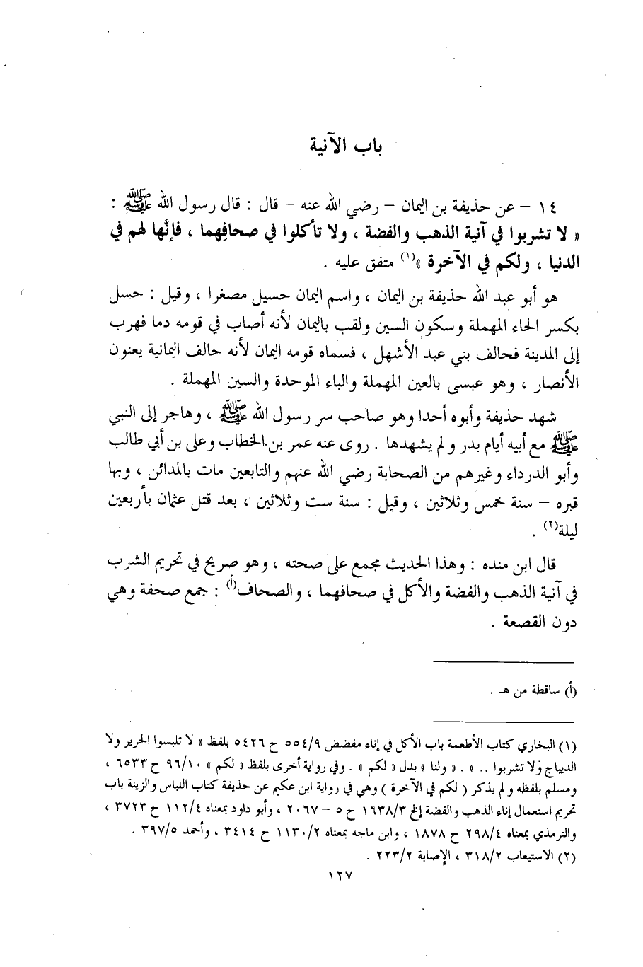 14 - عن حذيفة بن اليمان - رضي الله عنه - قال: قال رسول الله - صلى الله عليه وسلم -: "لا تشربوا في آنية الذهب والفضة، ولا تأكلوا في صحافِهما، فإنَّها لهم في الدينا، ولكم في الآخرة" (¬1) متفق عليه.