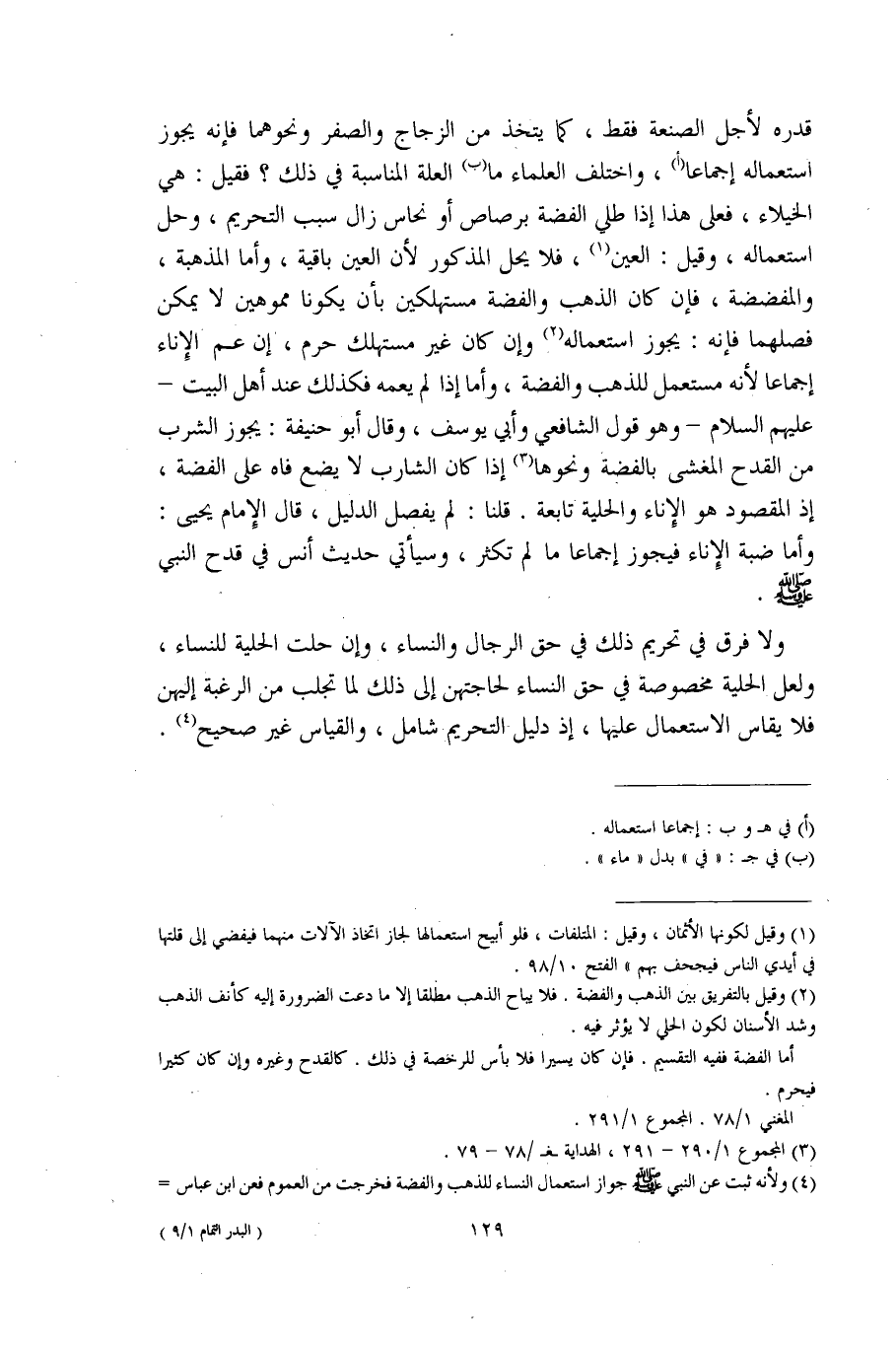 (¬1) وقيل لكونها الأثمان، وقيل: المتلفات، فلو أبيح استعمالها لجاز اتخاذ الآلات منهما فيفضي إلى قلتها في أيدي الناس فيجحف بهم" الفتح 10/ 98.