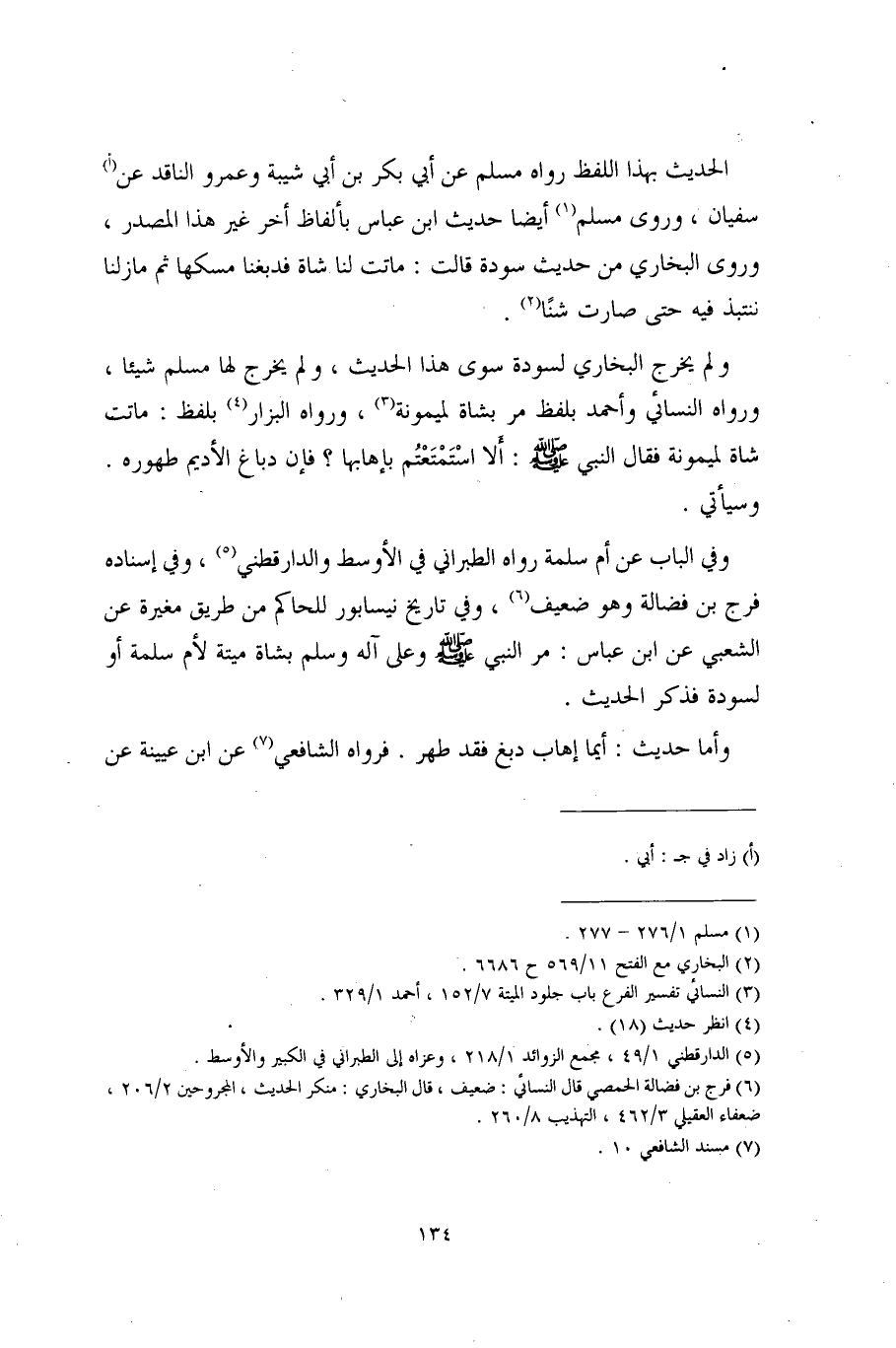 الحديث بهذا اللفظ رواه مسلم عن أبي بكر بن أبي شيبة وعمرو الناقد عن (أ) سفيان، وروى مسلم (¬1) أيضًا حديث ابن عباس بألفاظ أخر غير هذا المصدر، وروى البخاري من حديث سودة قالت: ماتت لنا شاة فدبغنا مسمكها ثم مازلنا ننتبذ فيه حتى صارت شنًا (¬2).