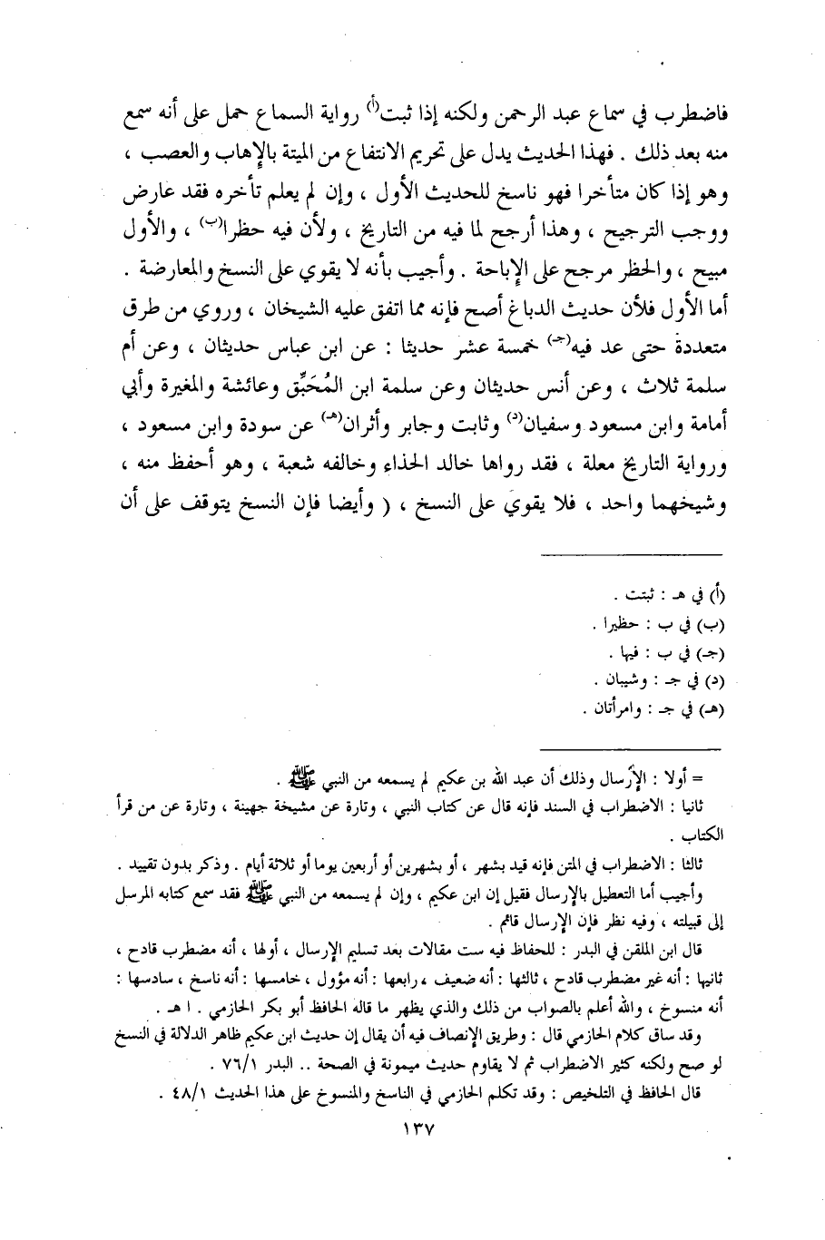 فاضطرب في سماع عبد الرحمن ولكنه إذا ثبت (أ) رواية السماع حمل على أنه سمع منه بعد ذلك. فهذا الحديث يدل على تحريم الانتفاع من الميتة بالإِهاب والعصب، وهو إذا كان متأخرا فهو ناسخ للحديث الأول، وإن لم يعلم تأخره فقد عارض ووجب الترجيح، وهذا أرجح لما فيه من التاريخ، ولأن فيه حظرا (ب)، والأول مبيح، والحظر مرجح على الإِباحة. وأجيب بأنه لا يقوي على النسخ والمعارضة. أما الأول فلأن حديث الدباغ أصح فإنه مما اتفق عليه الشيخان، وروي من طرق متعددة حتى عد فيه (جـ) خمسة عشر حديثًا: عن ابن عباس حديثان، وعن أم سلمة ثلاث، وعن أنس حديثان وعن سلمة ابن المُحَبِّق وعائشة والمغيرة وأبي أمامة وابن مسعود وسفيان (د) وثابت وجابر وأثران (هـ) عن سودة وابن مسعود، ورواية التاريخ معلة، فقد رواها خالد الحذاء وخالفه شعبة، وهو أحفظ منه، وشيخهما واحد، فلا يقوي على النسخ، (وأيضًا فإن النسخ يتوقف على أن