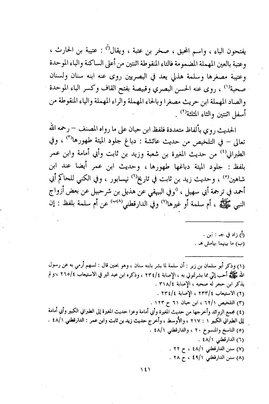 الحديث روي بألفاظ متعددة فلفظ ابن حبان على ما رواه المصنف -رحمه الله تعالى- في التلخيص من حديث عائشة: دباغ جلود الميتة طهورها (¬3)، وفي الطبراني (¬4) من حديث المغيرة بن شعبة وزيد بن ثابت وأبي أمامة وابن عمر بلفظ: جلود الميتة دباغها طهورها، وحديث ابن عمر أيضًا عند ابن شاهين (¬5)، وحديث زيد بن ثابت في تاريخ (¬6) نيسابور، وفي الكنى للحاكم أبي أحمد في ترجمة أبي سهيل، (ب وفي البيهقي عن هذيل بن شرحبيل عن بعض أزواج النبي - صلى الله عليه وسلم -، أم سلمة أو غيرها (¬7) وفي الدارقطني (¬8) ب) عن أم سلمة بلفظ: إن