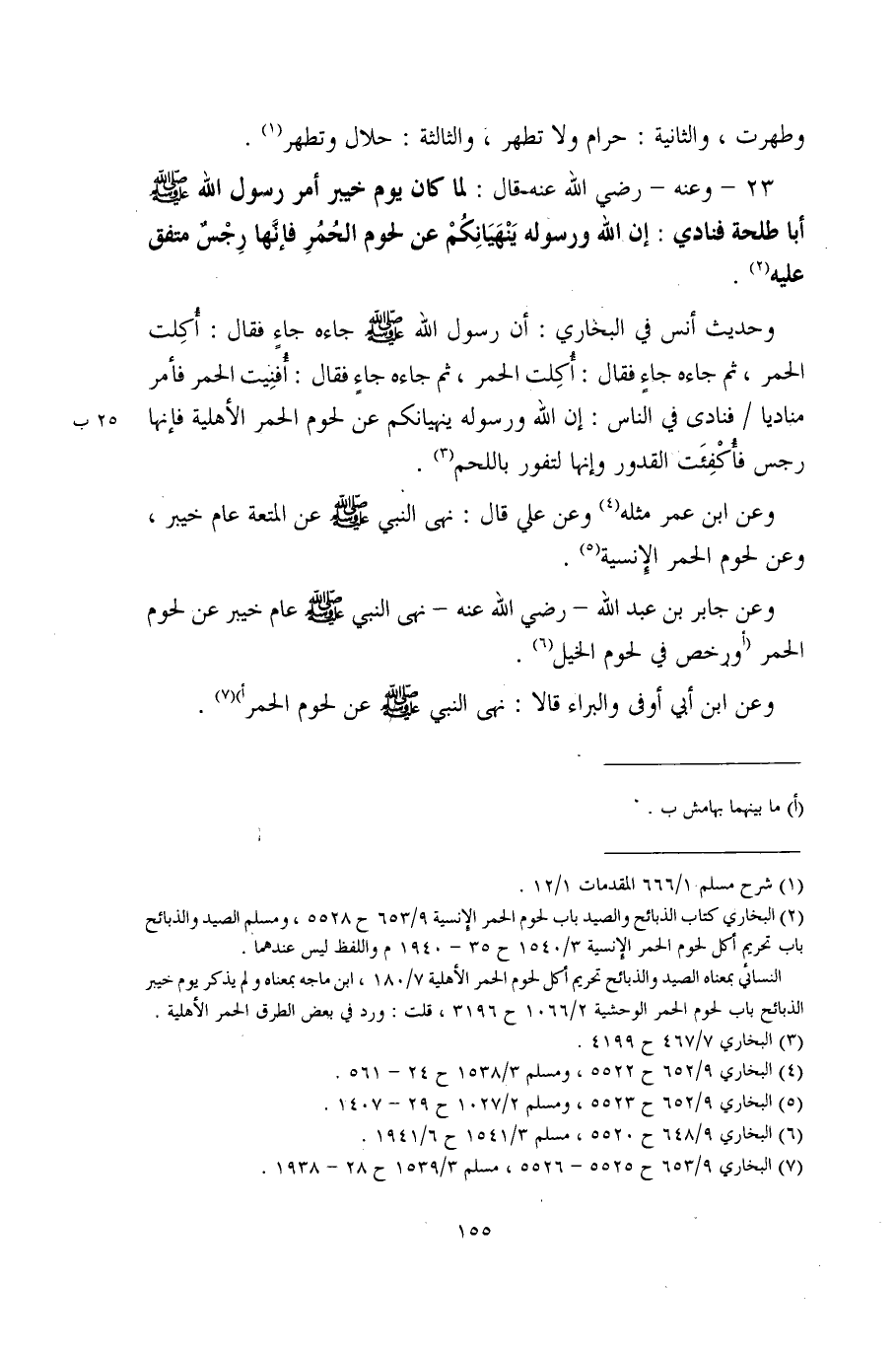 23 - وعنه - رضي الله عنه قال: لما كان يوم خيبر أمر رسول الله - صلى الله عليه وسلم - أبا طلحة فنادى: إن الله ورسوله يَنْهيَانِكُم عن لحوم الحُمُرِ فإنَّها رِجْسٌ متفق عليه (¬2).