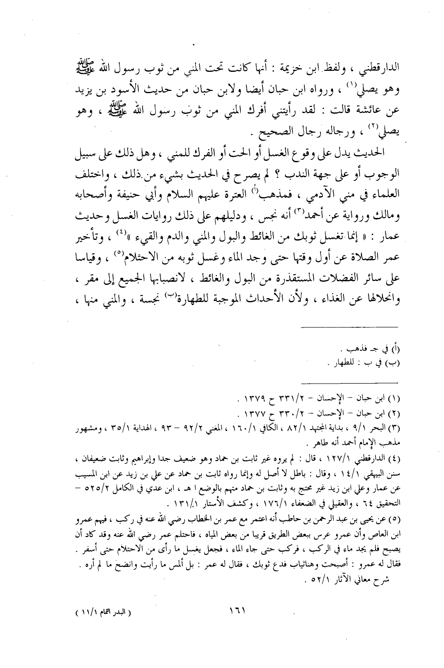 (¬5) عن يحيى بن عبد الرحمن بن حاطب أنه اعتمر مع عمر بن الخطاب رضي الله؛ عنه في ركب، فيهم عمرو بن العاص وأن عمرو عرس ببعض الطريق قريبا من بعض المياه، فاحتلم عمر رضي الله عنه وقد كاد أن يصبح فلم يجد ماء في الركب، فركب حتى جاء الماء، فجعل يغسل ما رأى من الاحتلام حتى أسفر. فقال له عمرو: أصبحت وهنا ثياب فدع ثوبك، فقال له عمر: بل ألمس ما رأيت وانضح ما لم أره. شرح معاني الآثار 1/ 52.
