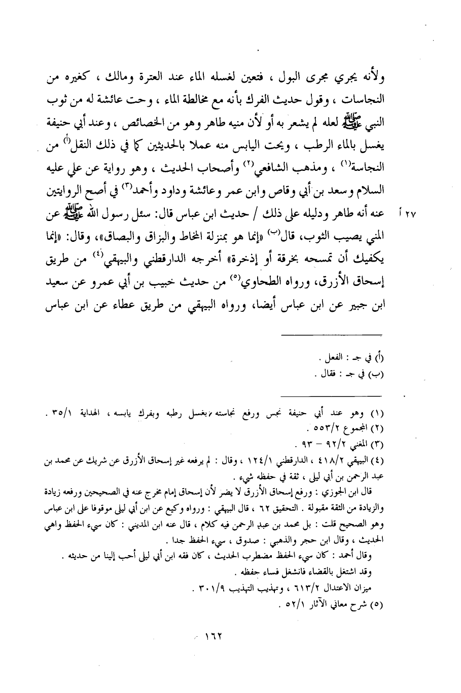 ولأنه يجري مجرى البول، فتعين لغسله الماء عند العترة ومالك، كغيره من النجاسات، وقول حديث الفرك بأنه مع مخالطة الماء، وحت عائشة له من ثوب النبي - صلى الله عليه وسلم - لعله لم يشعر به أو لأن منيه طاهر وهو من الخصائص، وعند أبي حنيفة يغسل بالماء الرطب، ويحت اليابس منه عملا بالحديثين كما في ذلك النقل (أ) من النجاسة (¬1)، ومذهب الشافعي (¬2) وأصحاب الحديث، وهو رواية عن علي عليه السلام وسعد بن أبي وقاص وابن عمر وعائشة وداود وأحمد (¬3) في أصح الروايتين عنه أنه طاهر ودليله على ذلك حديث ابن عباس قال: سئل رسول الله - صلى الله عليه وسلم - عن المني يصيب الثوب، قال (ب) "إنما هو بمنزلة المخاط والبزاق والبصاق"، وقال: "إنما يكفيك أن تمسحه بخرقة أو إذخرة" أخرجه الدارقطني والبيهقي (¬4) من طريق إسحاق الأزرق، ورواه الطحاوي (¬5) من حديث خبيب بن أبي عمرو عن سعيد بن جبير عن ابن عباس أيضًا، ورواه البيهقي من طريق عطاء عن ابن عباس