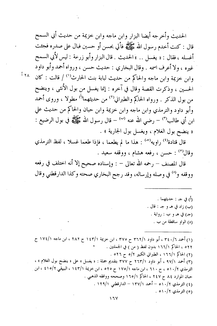 (¬3) أحمد 1/ 97، أبو داود 1/ 263 ح 377 بتقديم جملة: "يغسل" على "ينضح بول الغلام"، الترمذي 2/ 510، ح 610، ابن ماجه 1/ 175 ح 525، ابن خزيمة 1/ 143، البيهقي 2/ 415، ابن حبان الموارد 84 ح 247، الحاكم 1/ 16 وصححه ووافقه الذهبي.