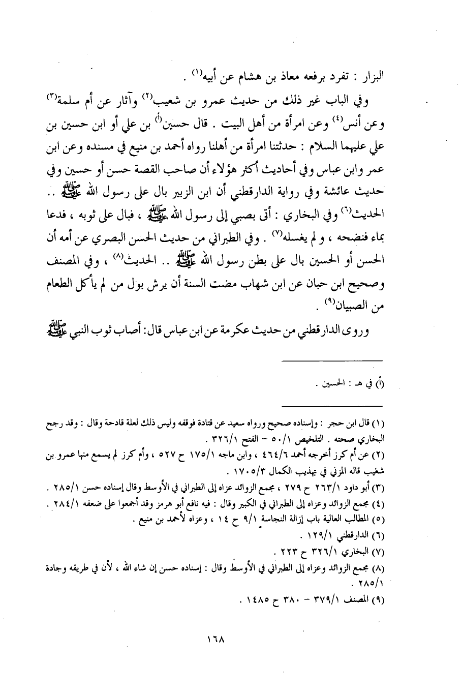 وفي الباب غير ذلك من حديث عمرو بن شعيب (¬2) وآثار عن أم سلمة (¬3) وعن أنس (¬4) وعن امرأة من أهل البيت. قال حسين (أ) بن علي أو ابن حسين بن علي عليهما السلام: حدثتنا امرأة من أهلنا رواه أحمد بن منيع في مسنده وعن ابن عمر وابن عباس وفي أحاديث أكثر هؤلاء أن صاحب القصة حسن أو حسين وفي حديث عائشة وفي رواية الدارقطني أن ابن الزبير بال على رسول الله - صلى الله عليه وسلم - .. الحديث (¬5) (¬6) وفي البخاري: أتى بصبي إلى رسول الله - صلى الله عليه وسلم -، فبال على ثوبه، فدعا بماء فنضحه، ولم يغسله (¬7). وفي الطبراني من حديث الحسن البصري عن أمه أن الحسن أو الحسين بال على بطن رسول الله - صلى الله عليه وسلم - .. الحديث (¬8)، وفي المصنف وصحيح ابن حبان عن ابن شهاب مضت السنة أن يرش بؤل من لم يأكل الطعام من الصبيان (¬9).