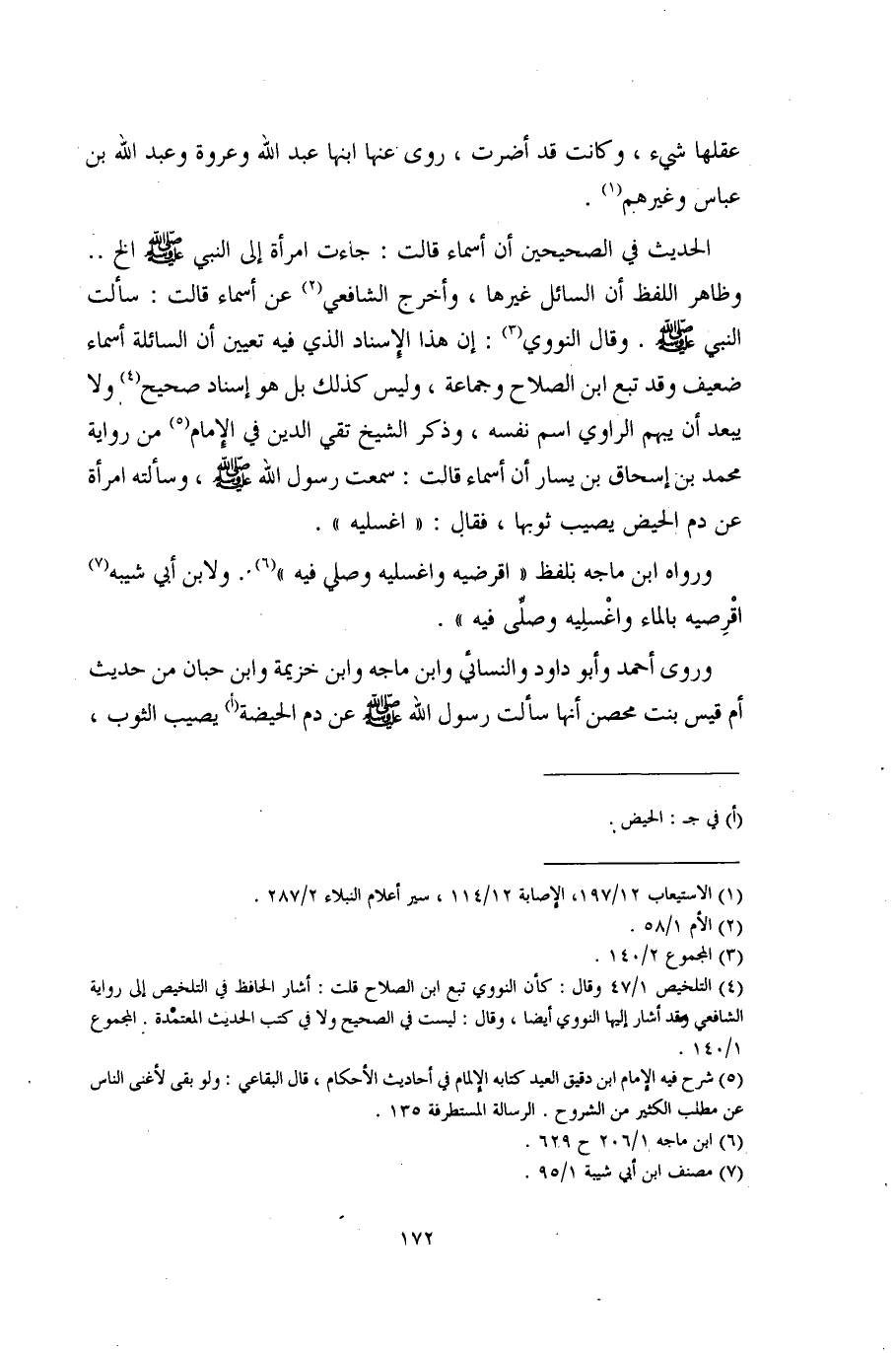 الحديث في الصحيحين أن أسماء قالت: جاءت امرأة إلى النبي - صلى الله عليه وسلم - الخ .. وظاهر اللفظ أن السائل غيرها، وأخرج الشافعي (¬2) عن أسماء قالت: سألت النبي - صلى الله عليه وسلم -. وقال النووي (¬3): إن هذا الإسناد الذي فيه تعيين أن السائلة أسماء ضعيف وقد تبع ابن الصلاح وجماعة، وليس كذلك بل هو إسناد صحيح (¬4) ولا يبعد أن يبهم الراوي اسم نفسه، وذكر الشيخ تقي الدين في الإمام (¬5) من رواية محمد بن إسحاق بن يسار أن أسماء قالت: سمعت رسول الله - صلى الله عليه وسلم -، وسألته امرأة عن دم الحيض يصيب ثوبها، فقال: "اغسليه".